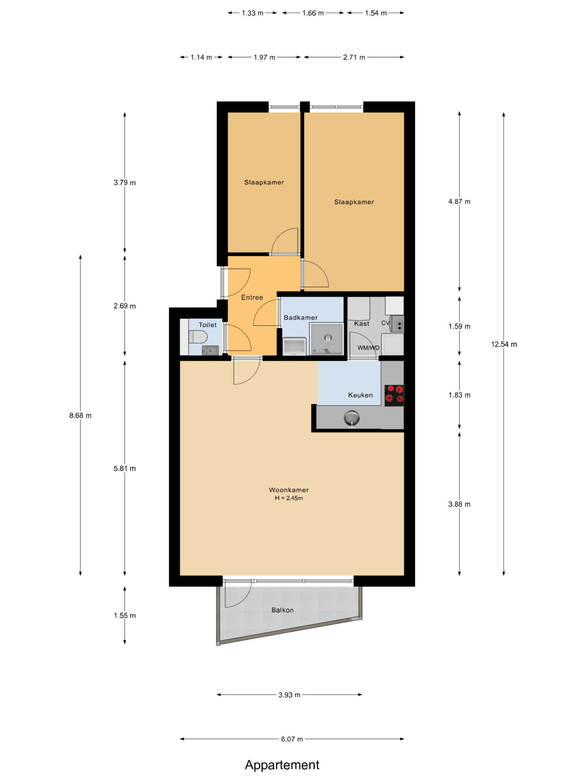 Daarnaast beschikt het appartement over twee slaapkamers van goed formaat, waarvan één ideaal als hoofdslaapkamer en één als logeer- of werkkamer.