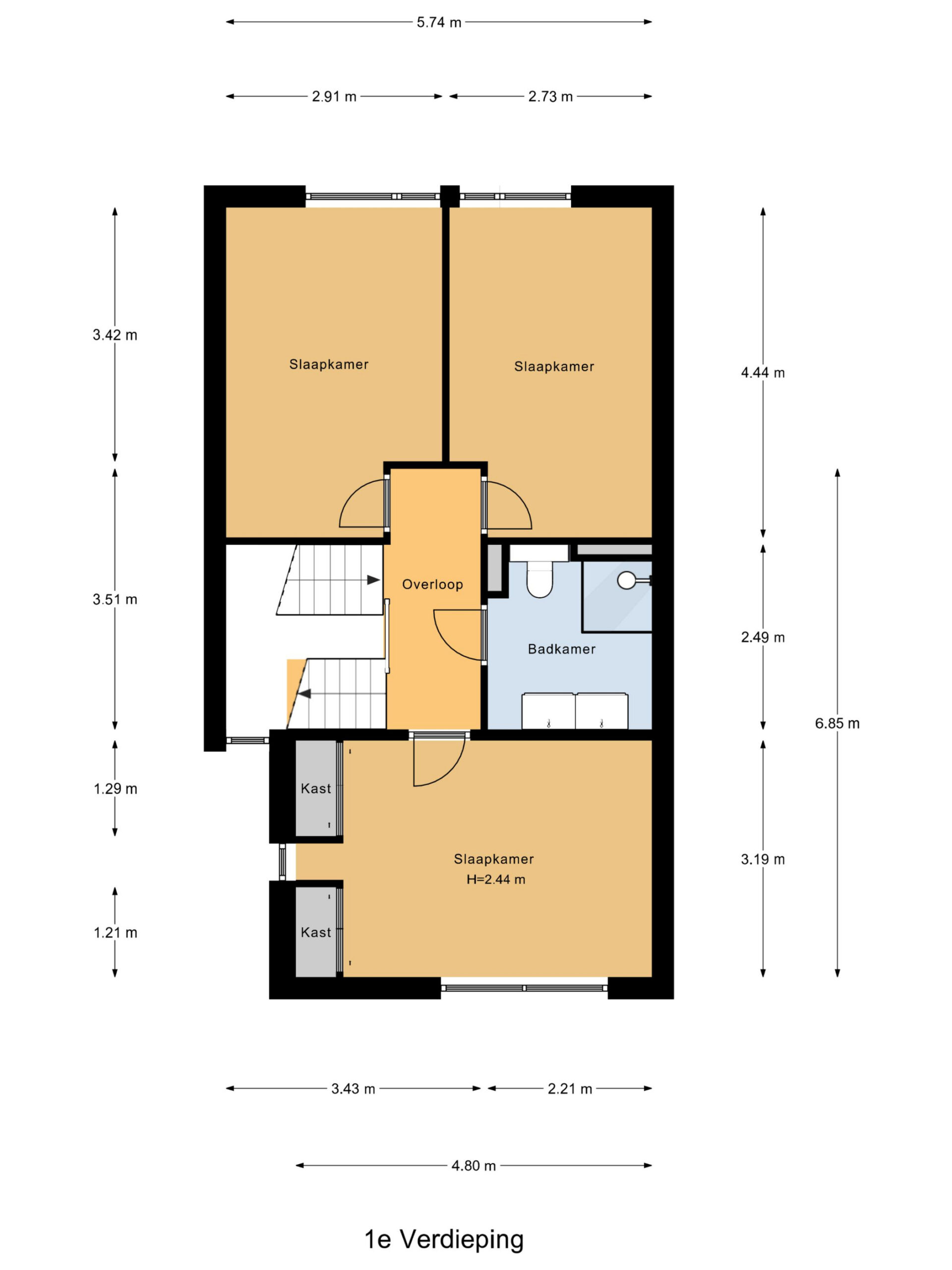 De overloop biedt toegang tot drie goed bemeten slaapkamers. De hoofdslaapkamer, gelegen aan de voorzijde, is voorzien van een vaste kastenwand. De twee slaapkamers aan de achterzijde beschikken over rolluiken. De moderne badkamer is volledig betegeld en uitgerust met een inloopdouche, tweede toilet en dubbele wastafel.