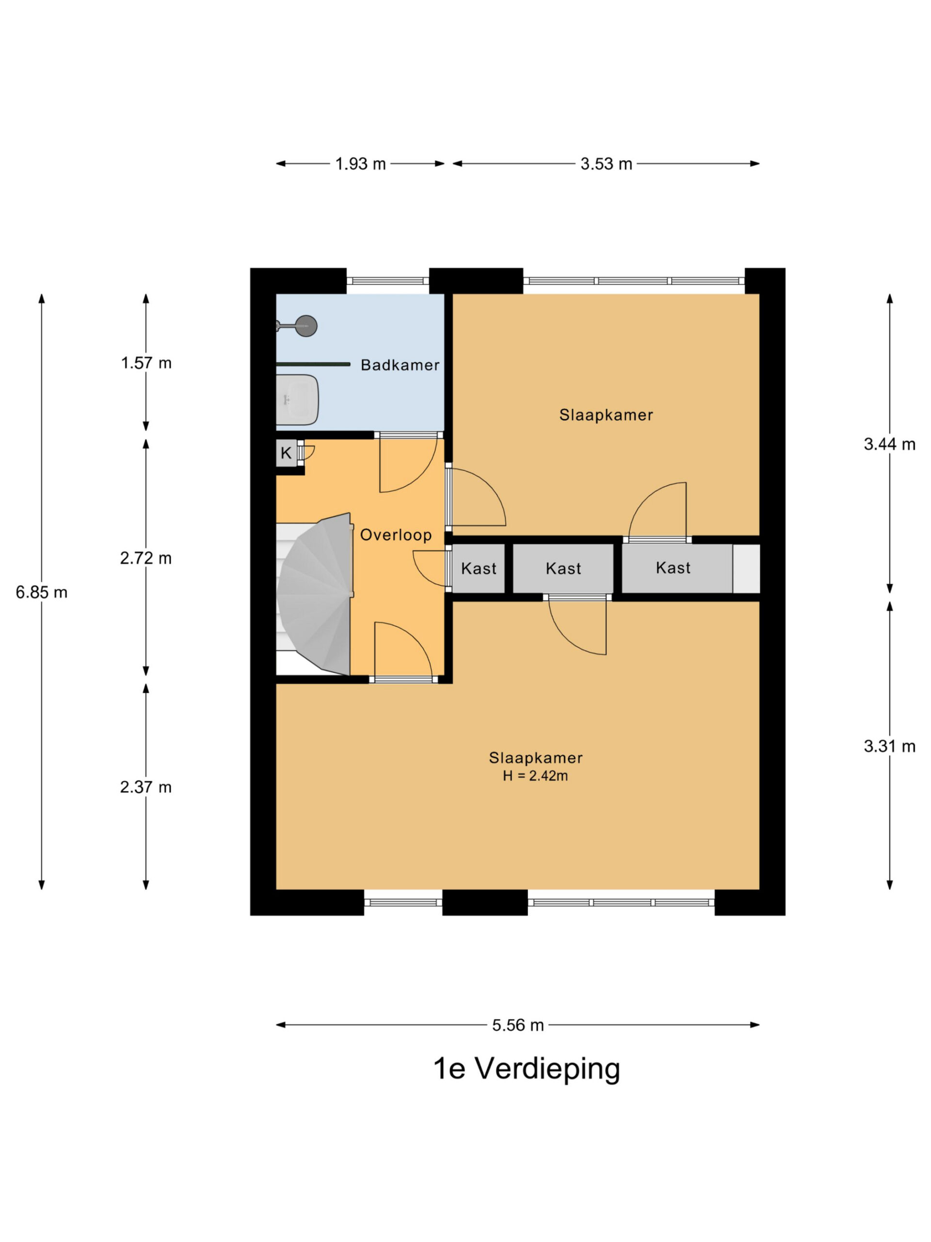 Op de eerste verdieping bevinden zich de badkamer en 2 slaapkamers die eenvoudig weer naar de oorspronkelijke 3 slaapkamers gebracht kunnen worden. Beide slaapkamers beschikken over een vaste kast. De badkamer is eenvoudig uitgevoerd en voorzien van een douche en wastafel. Deze ruimte biedt de mogelijkheid om geheel naar eigen wens te moderniseren.