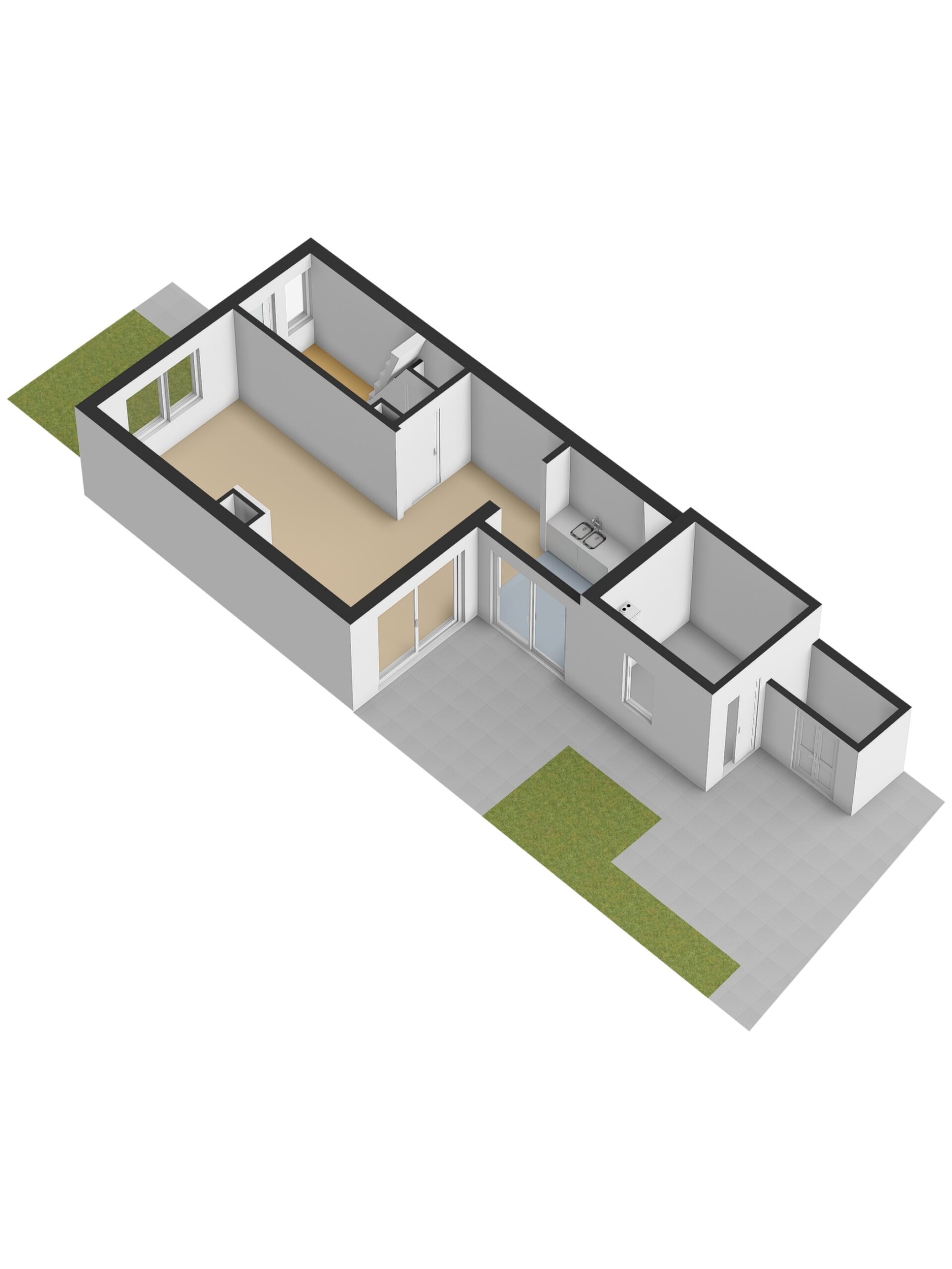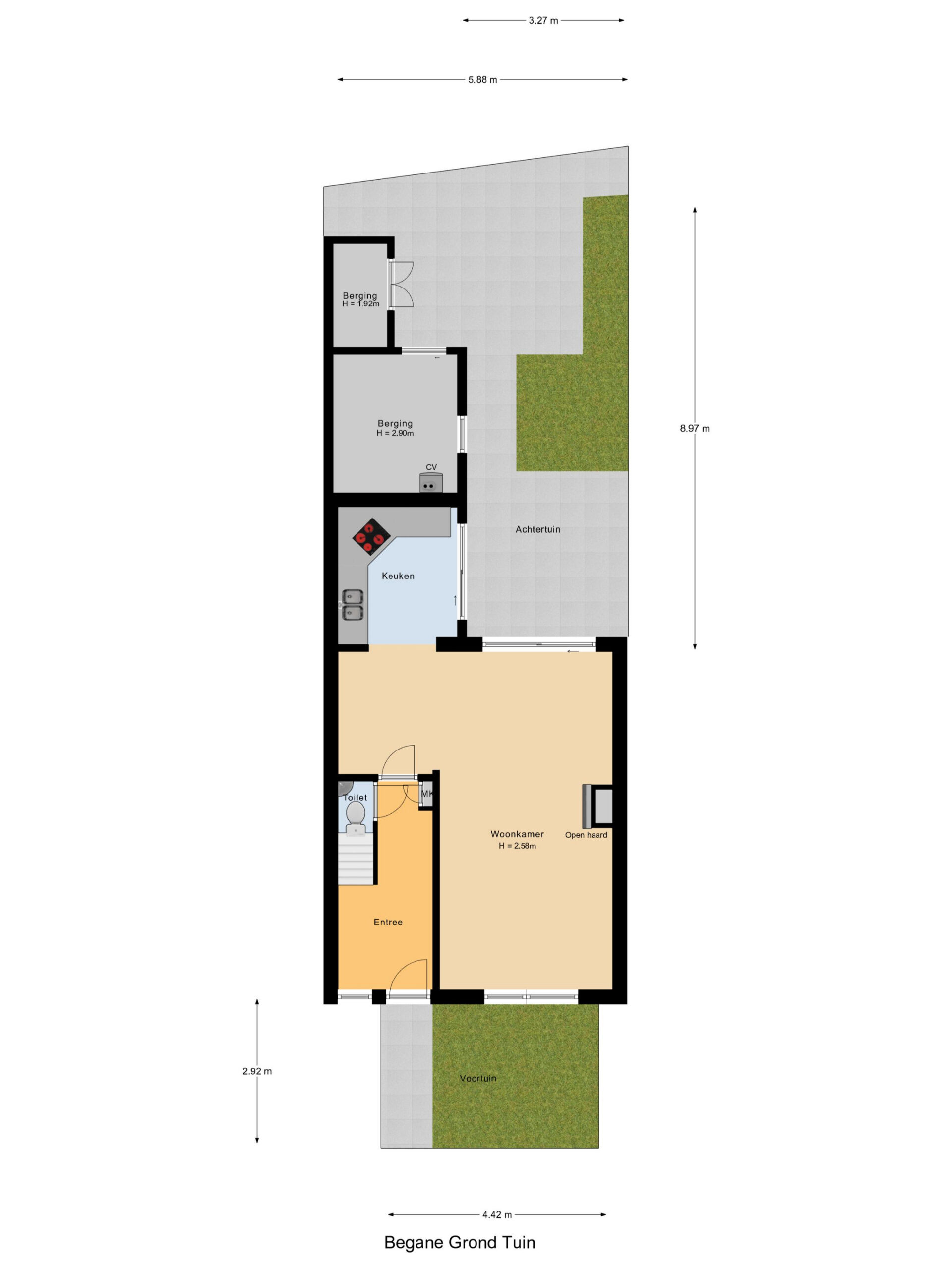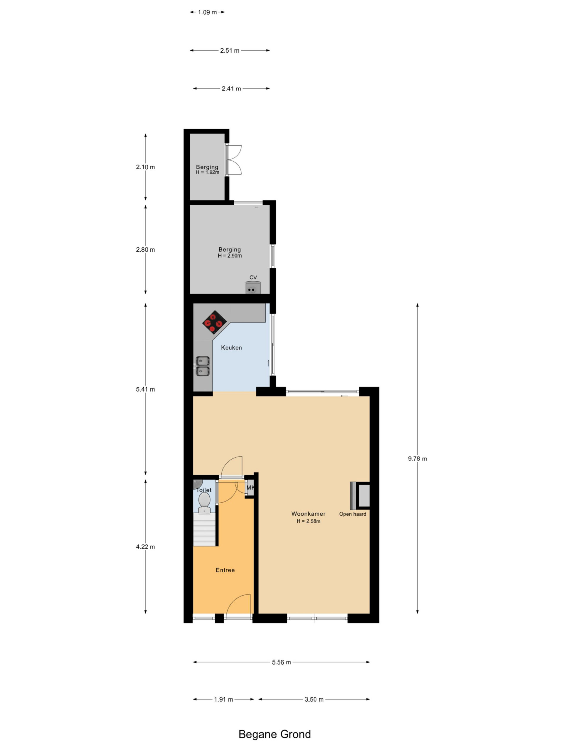 Via de voortuin bereikt u de entree van de woning. In de hal bevinden zich de meterkast, de toiletruimte en de trapopgang naar de eerste verdieping.