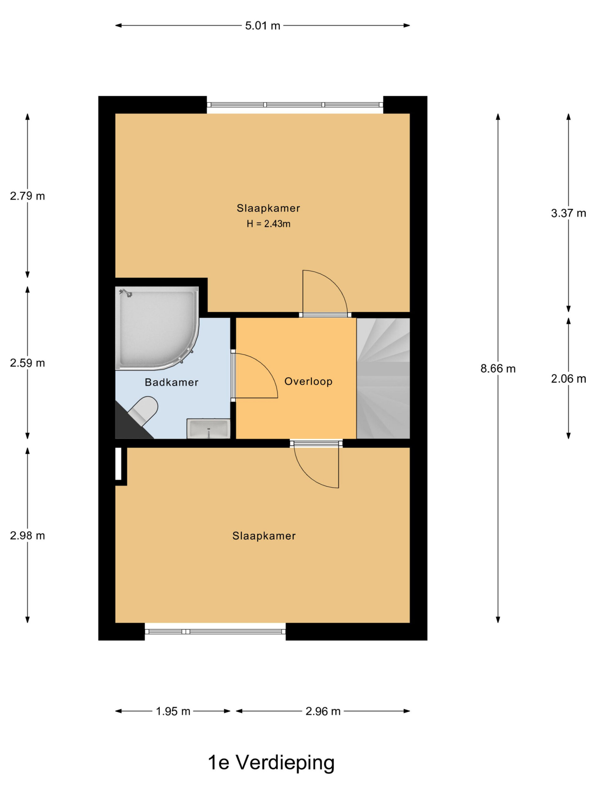 Op de eerste verdieping zijn twee ruime slaapkamers, één aan de voorzijde en één aan de achterzijde van de woning. De badkamer is in 2023 volledig vernieuwd en voorzien van een luxe stoom-/douchecabine, wastafelmeubel en een tweede toilet.