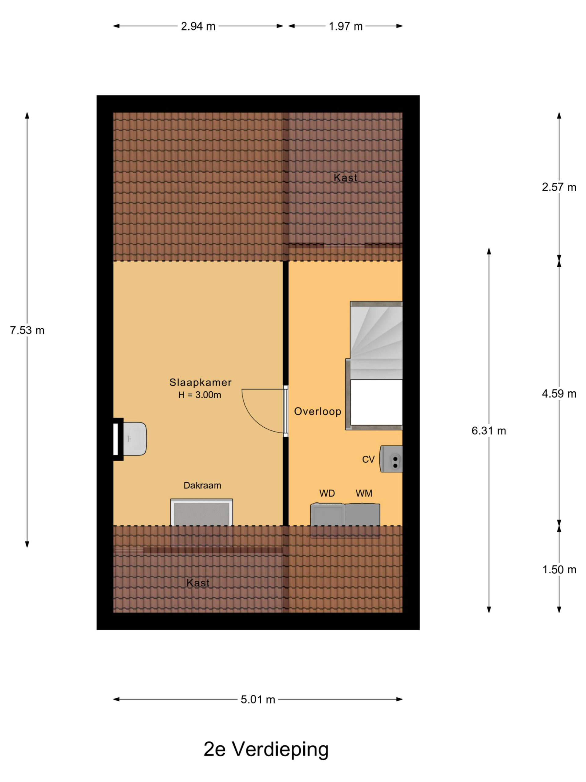 De zolderverdieping is praktisch ingedeeld. Hier vind je een derde slaapkamer met dakraam, extra kastruimte onder de schuine kap en een voorzolder met aansluitingen voor wasmachine en droger. Ook de cv-installatie (2010) en een wastafel zijn hier geplaatst.
