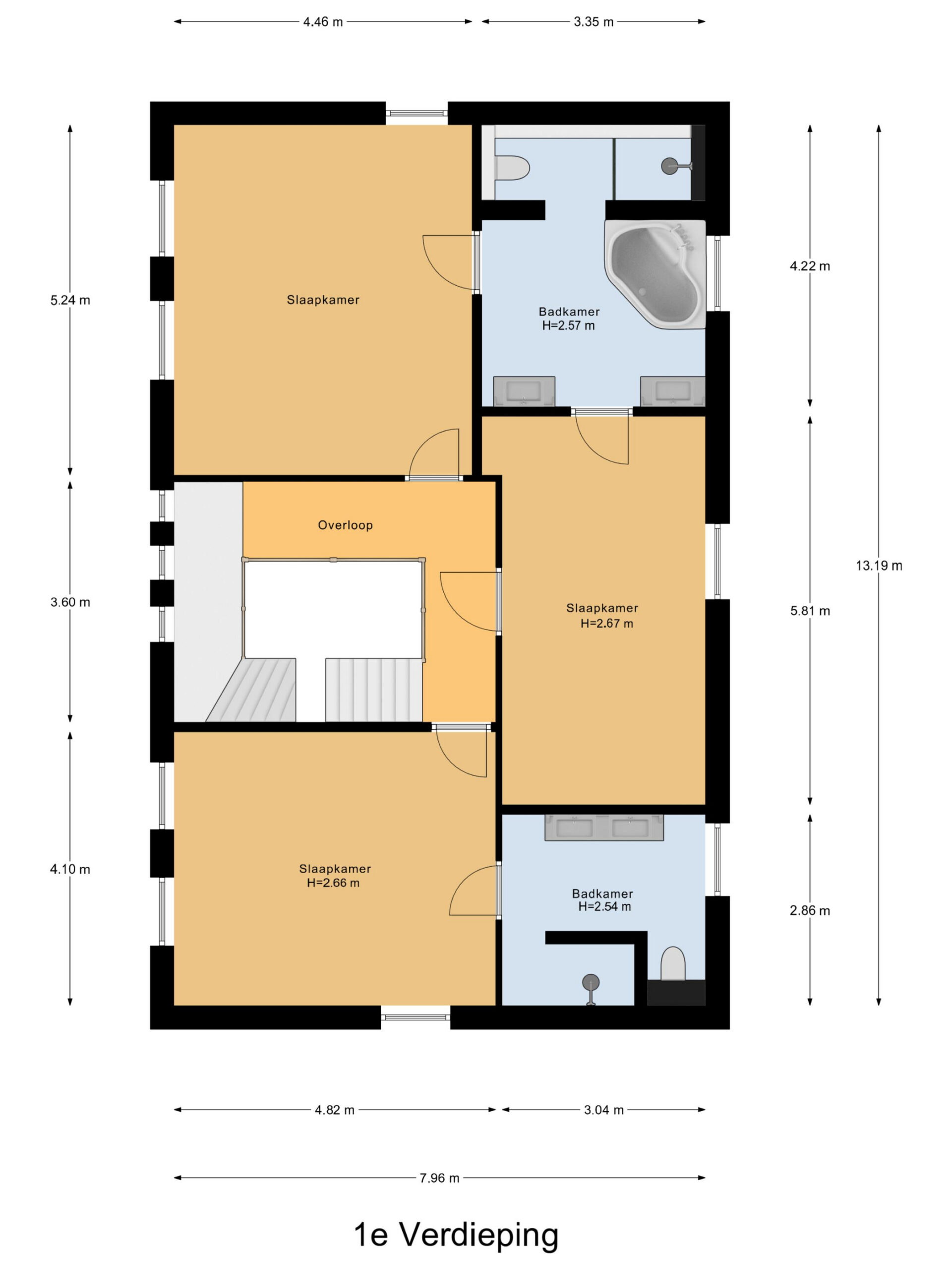 Via de trap bereikt u de ruime overloop van de eerste verdieping. Dankzij de vide en de aanwezige raampartijen profiteert deze verdieping van een prettige en natuurlijke lichtinval. Vanaf de overloop zijn drie royale slaapkamers en twee badkamers bereikbaar. De gehele verdieping is voorzien van een fraaie pvc visgraatvloer.