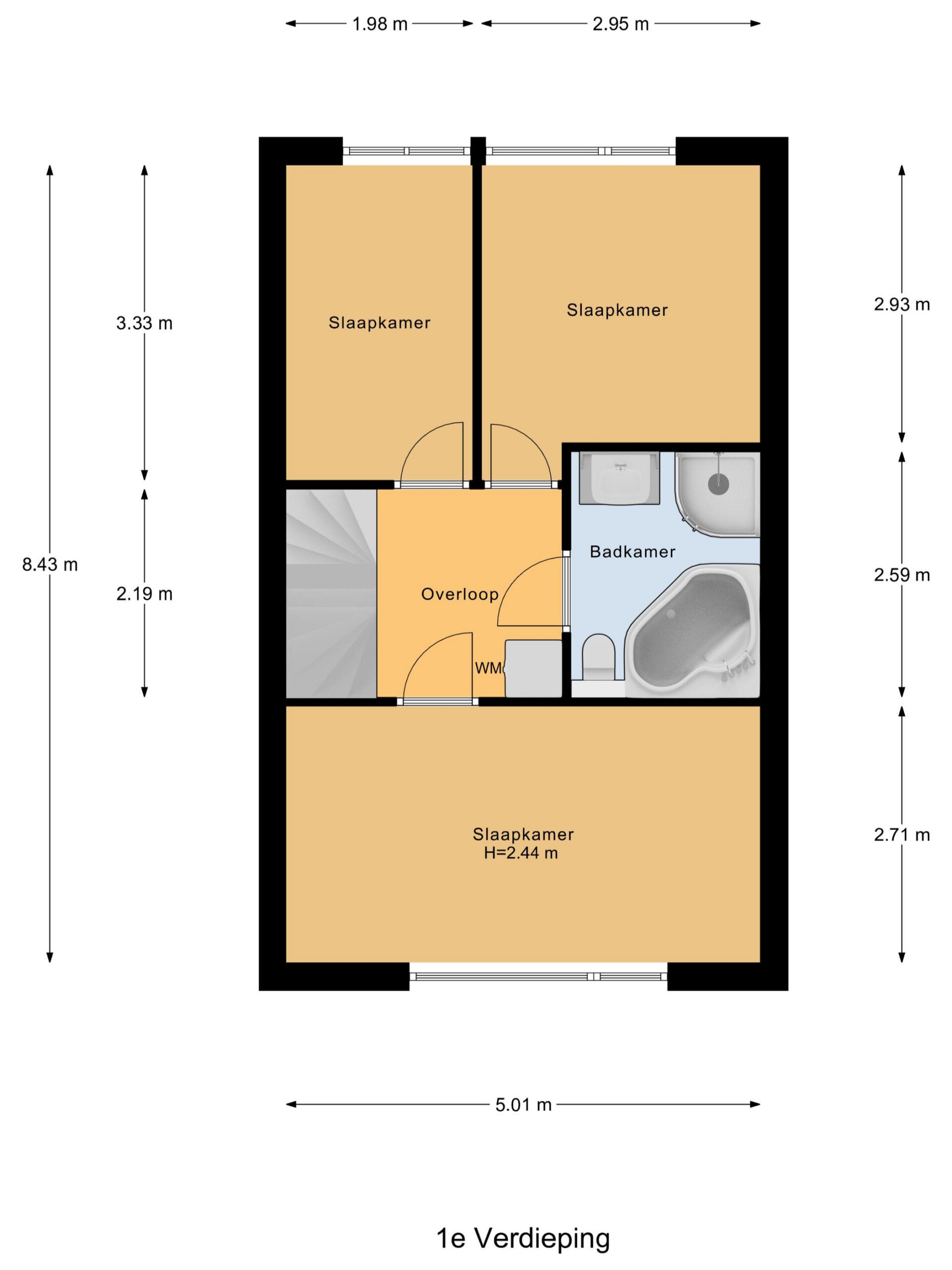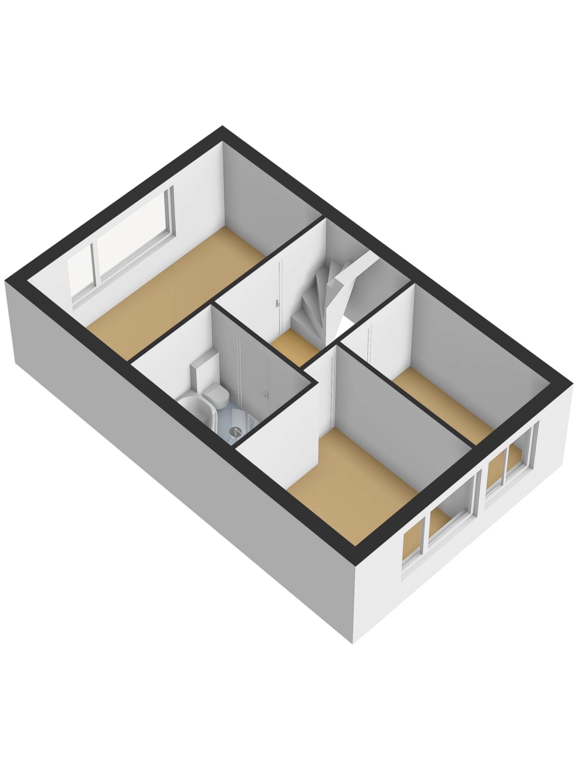 De eerste verdieping is bereikbaar via een vaste trap en biedt een praktische overloop met de wasmachineaansluiting. Op deze verdieping bevinden zich drie goed bemeten slaapkamers en de badkamer. De royale hoofdslaapkamer ligt aan de voorzijde van de woning, strekt zich uit over de volle breedte en beschikt over een vaste kast. De twee kamers aan de achterzijde zijn eveneens van goed formaat en kunnen flexibel worden ingericht als slaap-, werk- of hobbykamer.