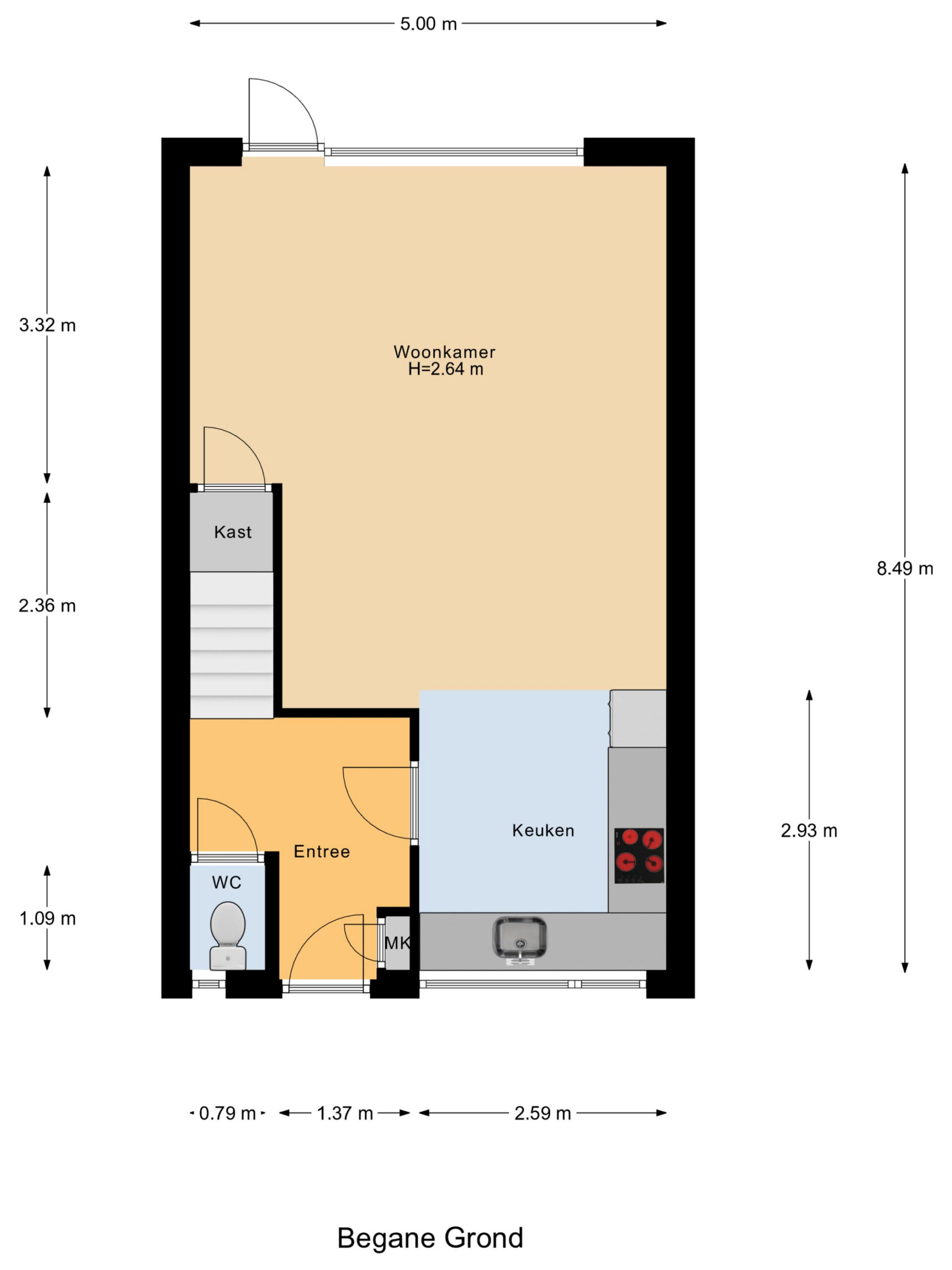 Via de verzorgde voortuin bereikt u de entree van de woning. De hal is praktisch ingedeeld met ruimte voor een garderobe, het toilet, de trapopgang naar de eerste verdieping en toegang tot de keuken.