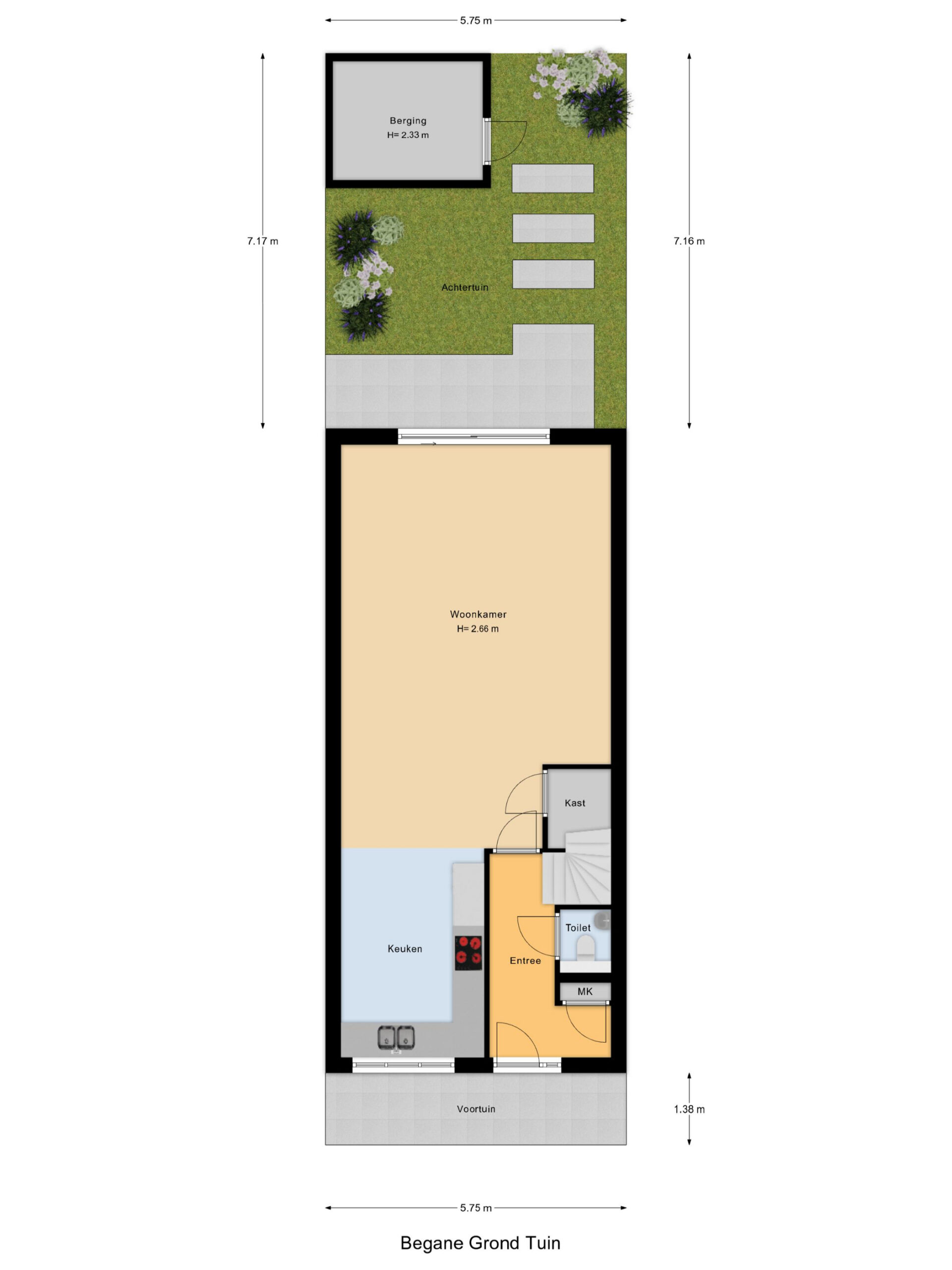 Via de verzorgde voortuin bereikt u de entree van de woning. In de hal bevinden zich de meterkast, het toilet met fonteintje en de trapopgang naar de eerste verdieping. De hal geeft toegang tot de lichte woonkamer, die in open verbinding staat met de keuken aan de voorzijde.