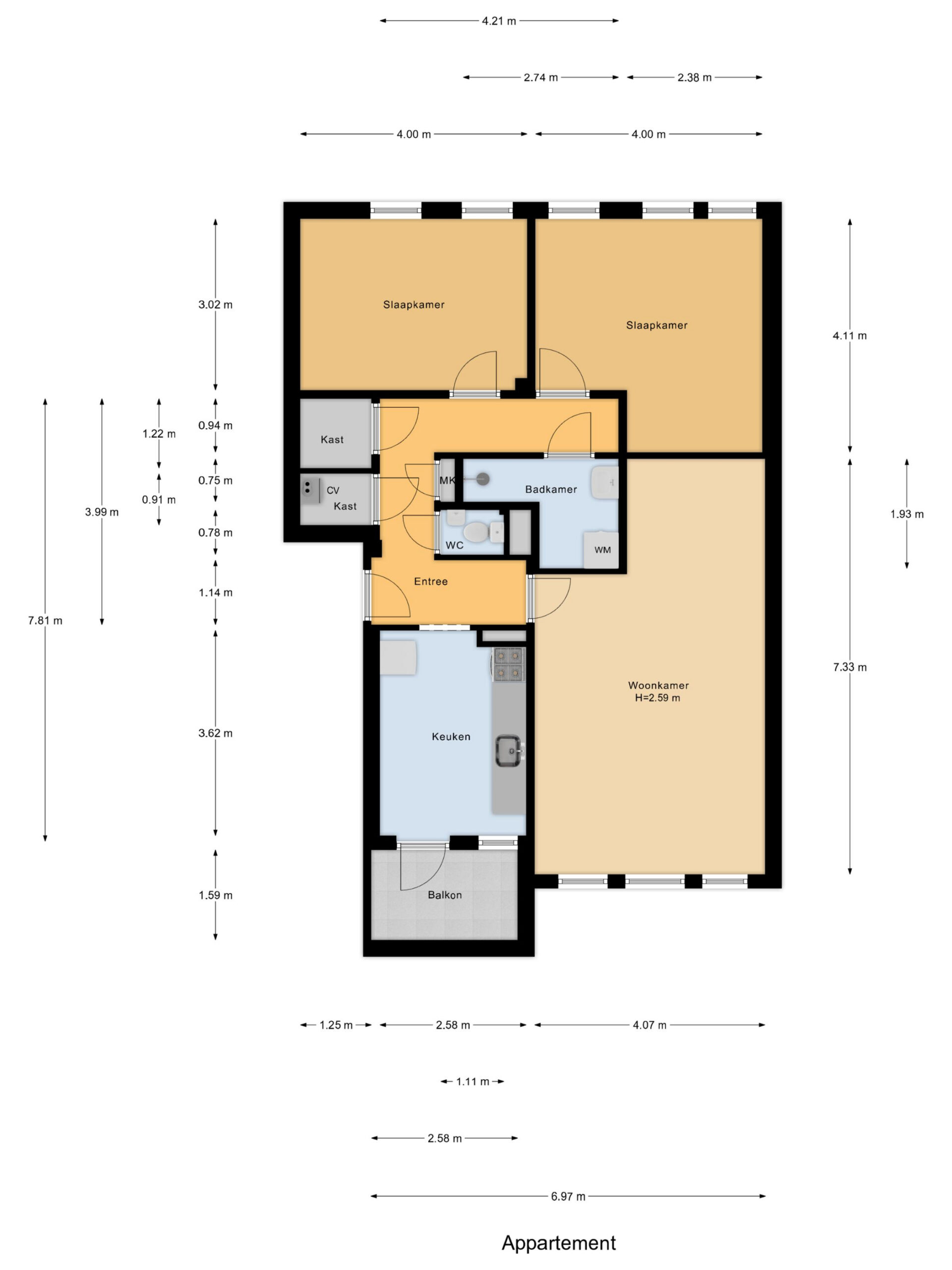 Er zijn twee goed bemeten slaapkamers die flexibel in te delen zijn als hoofdslaapkamer, werkkamer of logeerkamer. De badkamer is voorzien van een inloopdouche, wastafel en aansluitingen voor de wasmachine en droger. Vanuit de hal is bovendien het separate toilet bereikbaar.