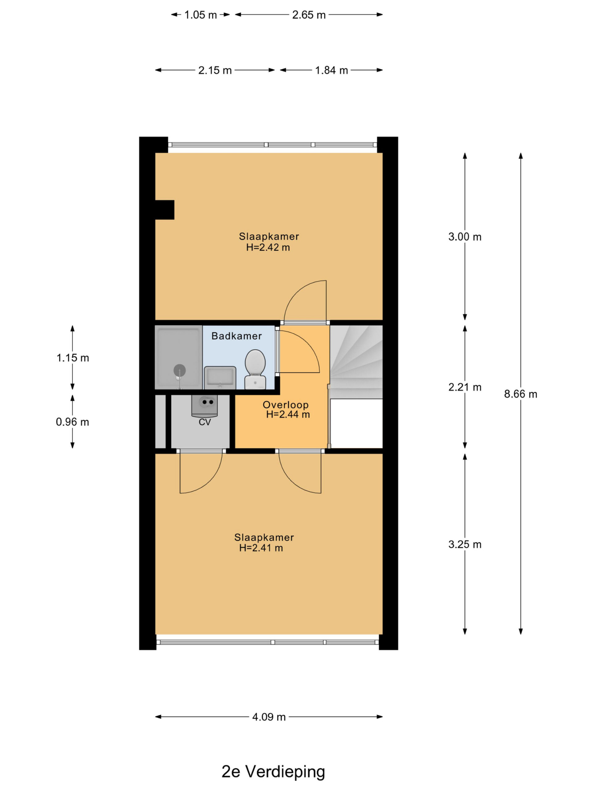 Via een vaste trap is de tweede verdieping bereikbaar. Op deze verdieping bevinden zich nog twee volwaardige slaapkamers en een overloop. De slaapkamers zijn prettig licht en geschikt voor uiteenlopende gebruiksdoeleinden, zoals slaap-, werk- of hobbyruimte. Ook hier zijn rolluiken aan de voor- en achterzijde aanwezig. Tevens bevindt zich hier de tweede badkamer, uitgevoerd met toilet, wastafel en douche. De cv-installatie is gesitueerd in een bergkast bij de slaapkamer aan de voorzijde.