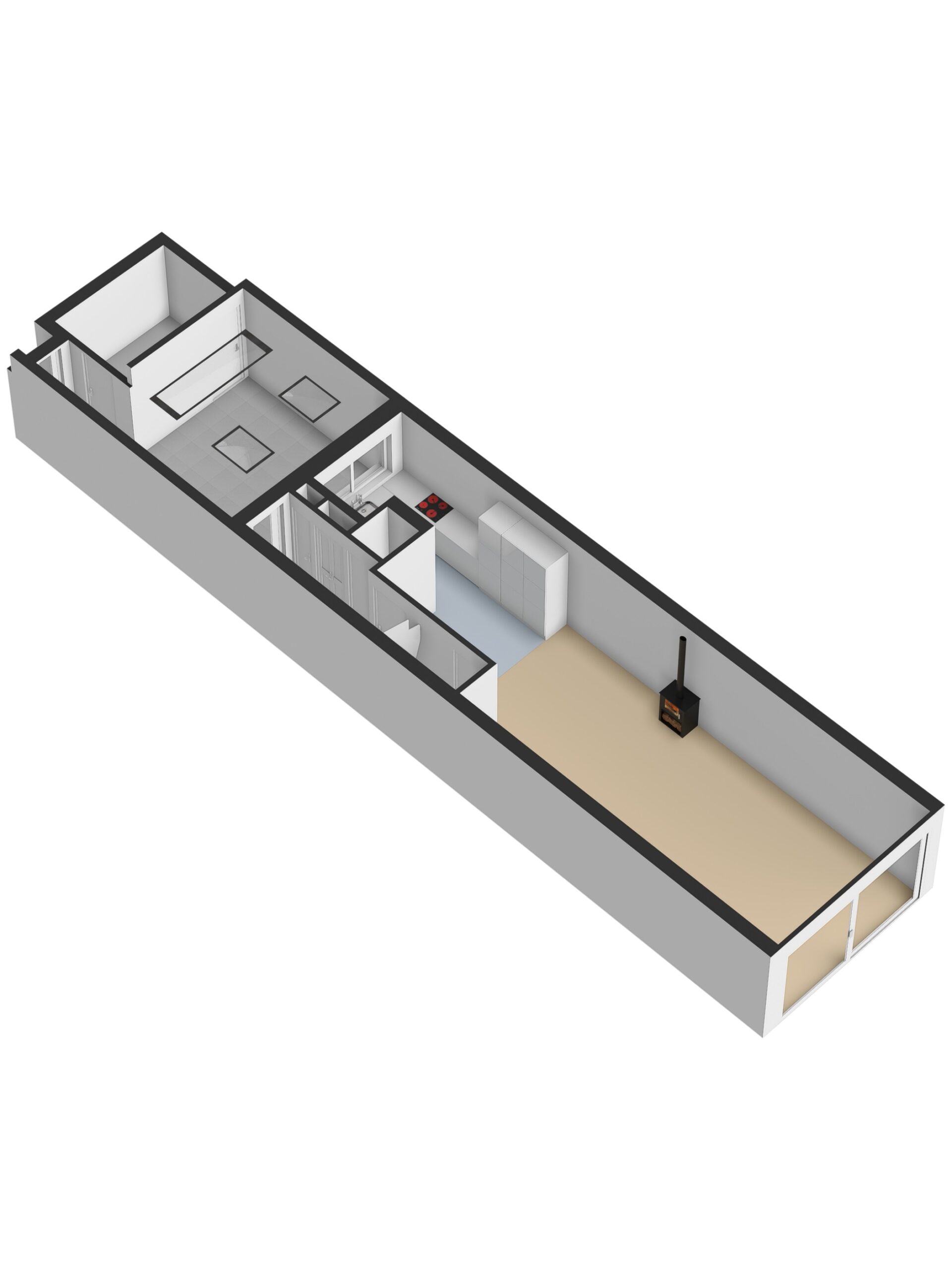 Vanuit de patio bereik je de entree van de woning. In de hal bevinden zich de meterkast, de toiletruimte met closet en fonteintje en de trapopgang naar de eerste verdieping. Vanuit hier loop je door naar de uitgebouwde woonkamer. Deze ruime leefruimte biedt volop mogelijkheden voor een comfortabele zit- en eethoek en wordt gekenmerkt door een prettige lichtinval dankzij de grote raampartijen aan de achterzijde. De woonkamer is voorzien van vloerverwarming en een houtkachel, wat zorgt voor extra wooncomfort en sfeer.
