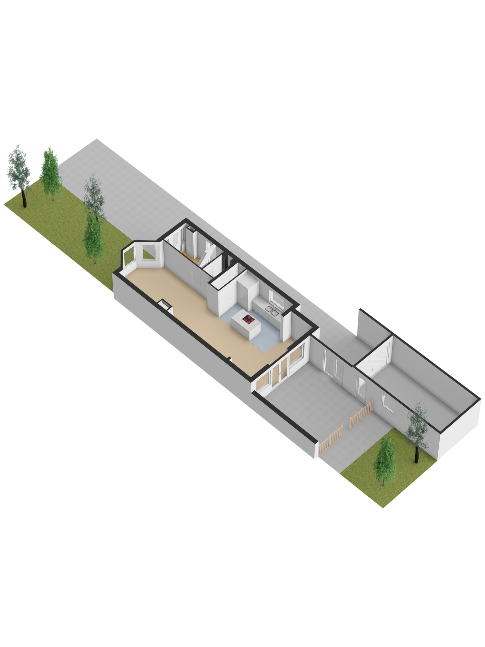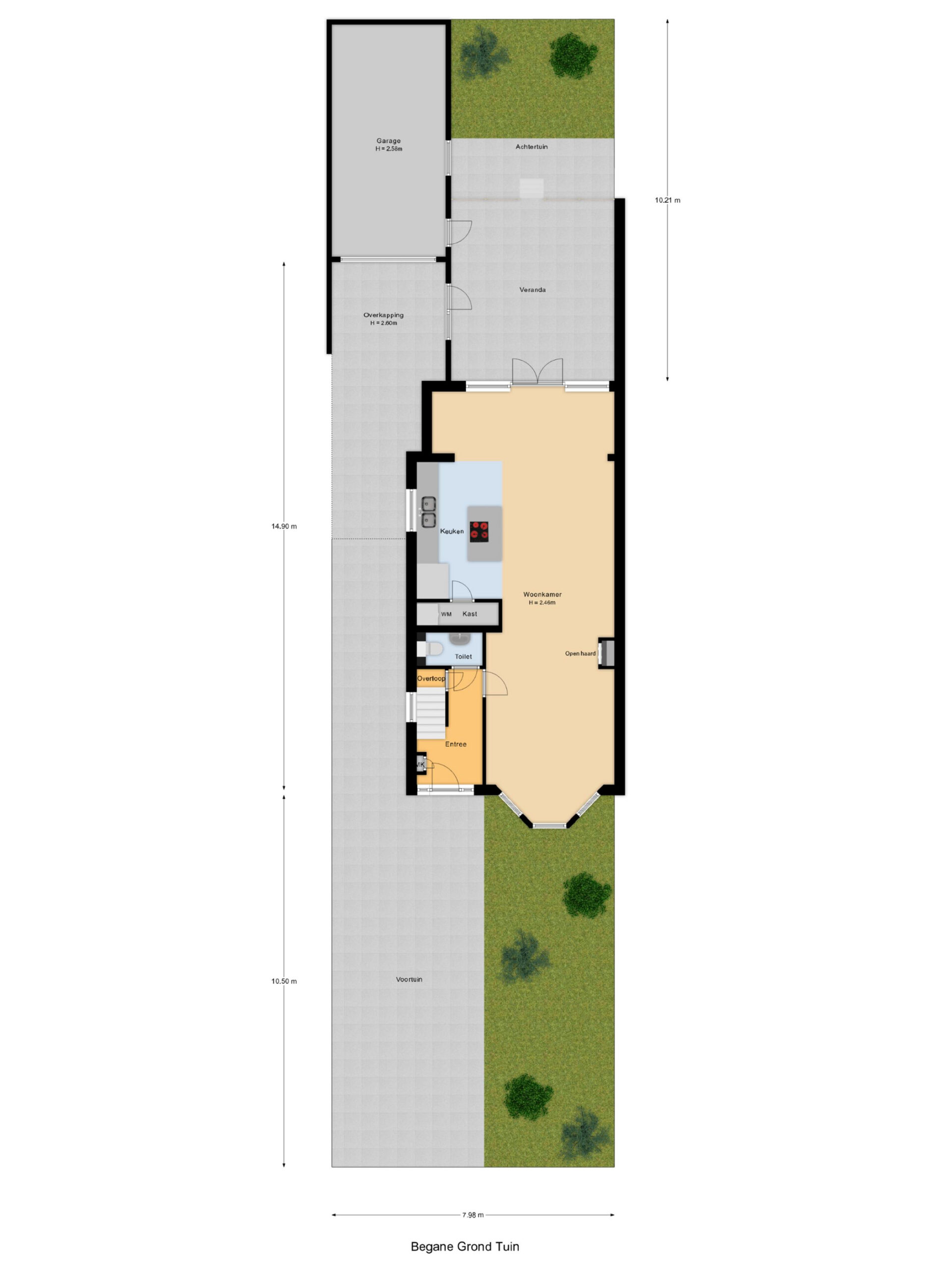 De woning staat op een perceel van 299 m² en beschikt over een voor-, zij- en achtertuin. De achtertuin is onderhoudsvriendelijk ingericht en beschikt over meerdere terrassen, waaronder een verhoogd terras bij de woning en een verlaagd gedeelte achterin de tuin. Hier is ook de vrijstaande stenen garage bereikbaar. De garage (ca. 6,55 meter diep) is voorzien van een kanteldeur en biedt volop ruimte voor opslag, klussen of het stallen van een auto.