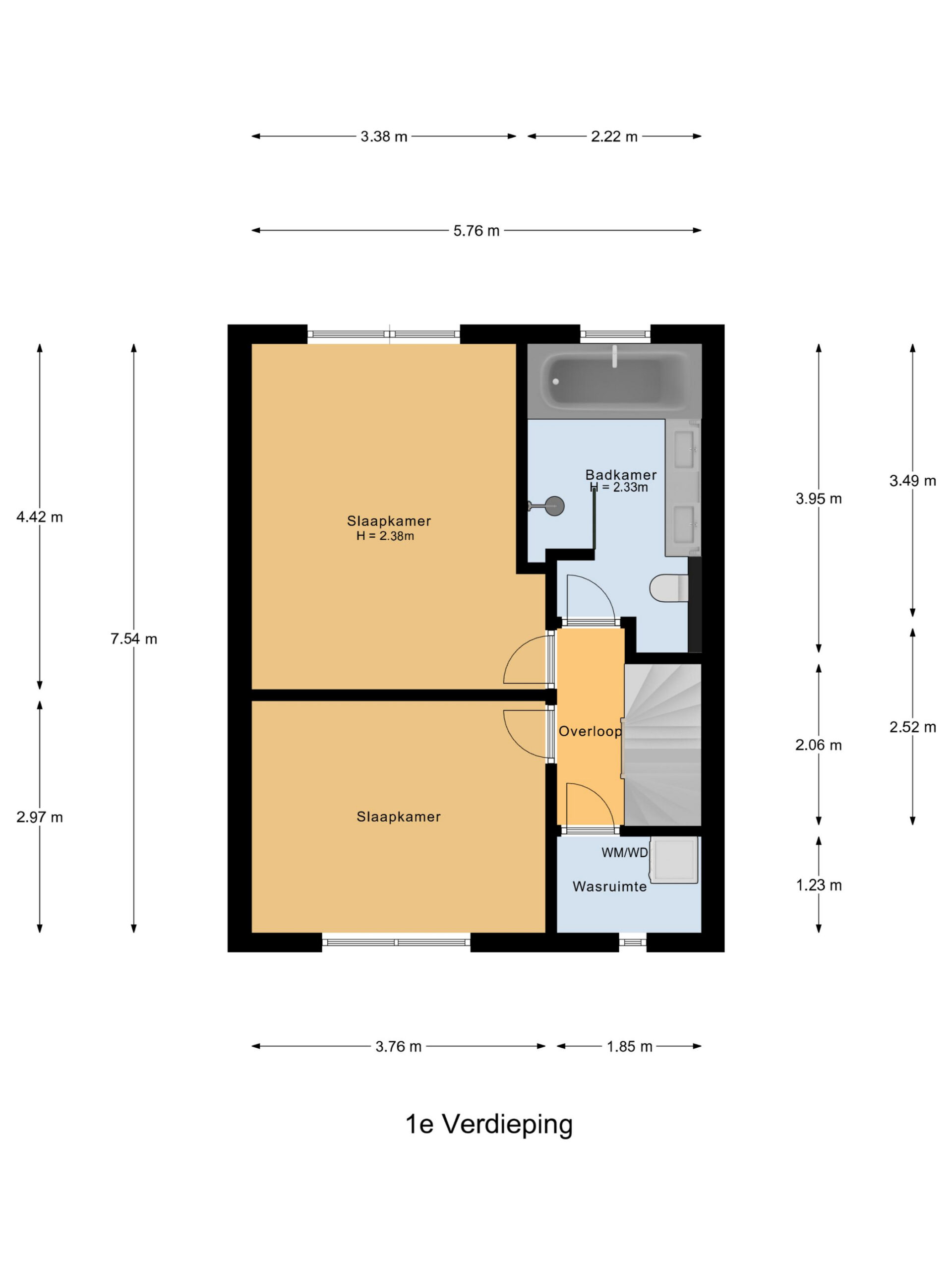 Via een vaste trap is de eerste verdieping bereikbaar. Hier bevinden zich 2 slaapkamers, de badkamer en een separate wasruimte. De hoofdslaapkamer ligt aan de achterzijde en biedt met een royaal vloeroppervlak van ca. 15 m² voldoende ruimte voor een tweepersoonsbed en een grote kastenwand. Ook de slaapkamer aan de voorzijde, van ca. 11 m², is prettig van formaat.