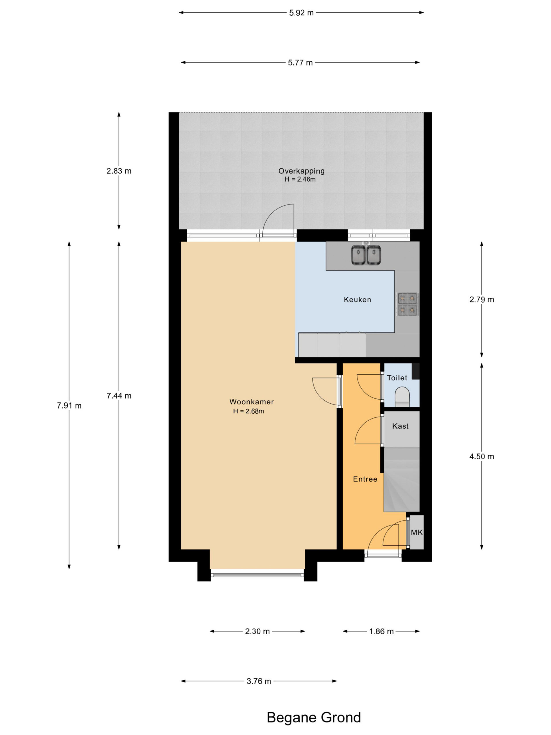 Via de verzorgde voortuin bereikt u de entree van de woning. In de langgerekte hal is ruimte voor een garderobe, en bevinden zich de meterkast, het toilet, een trapkast, de trapopgang naar de eerste verdieping en de toegangsdeur naar de woonkamer. De deur komt centraal uit in de woonkamer, met aan de voorzijde de zithoek en aan de achterzijde de eethoek, grenzend aan de open keuken. De keuken is uitgevoerd in een praktische U-opstelling met een neutrale kleurstelling en voorzien van vernieuwde inbouwapparatuur, waaronder een oven, magnetron, koel-/vriescombinatie en vaatwasser.