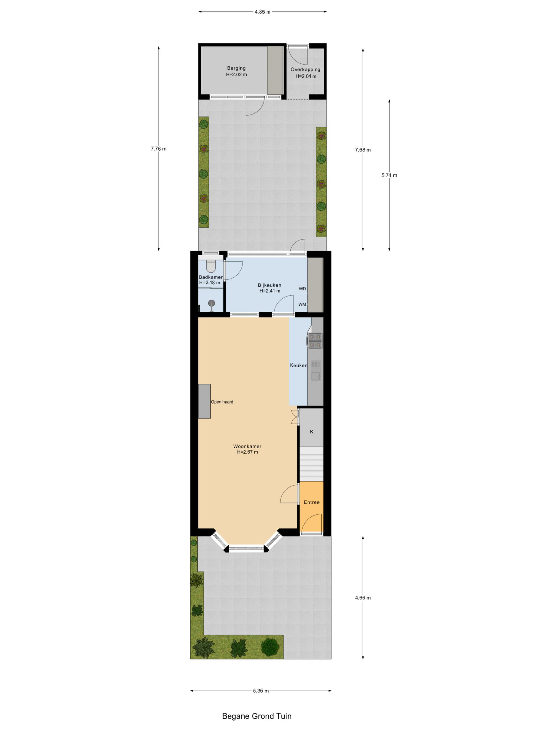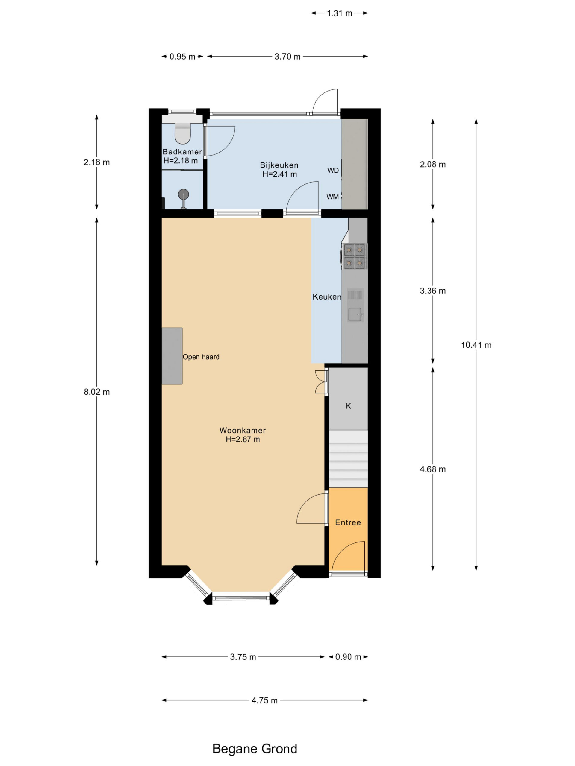 Via de voortuin betreedt u de woning. In de hal bevinden zich de meterkast, trapopgang naar de eerste verdieping en toegang tot de woonkamer.