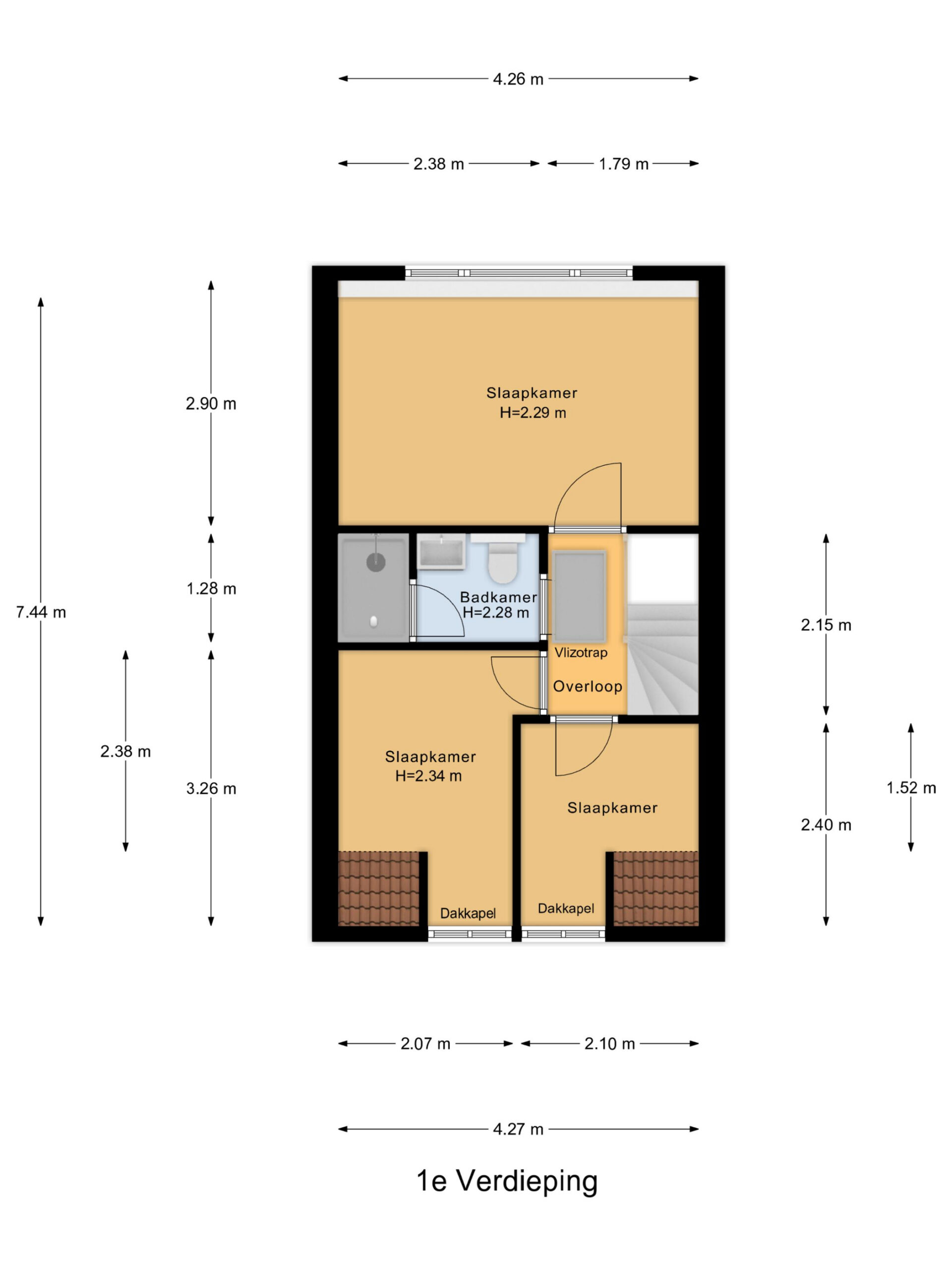 Op de eerste verdieping zijn 3 slaapkamers aanwezig. De dakkapellen aan de voor- en achterzijde zorgen voor extra ruimte en maken de kamers licht en goed bruikbaar. De badkamer is netjes en verzorgd, voorzien van een douche, wastafel en toilet. Via een vlizotrap is de zolder bereikbaar, ideaal als extra bergruimte.