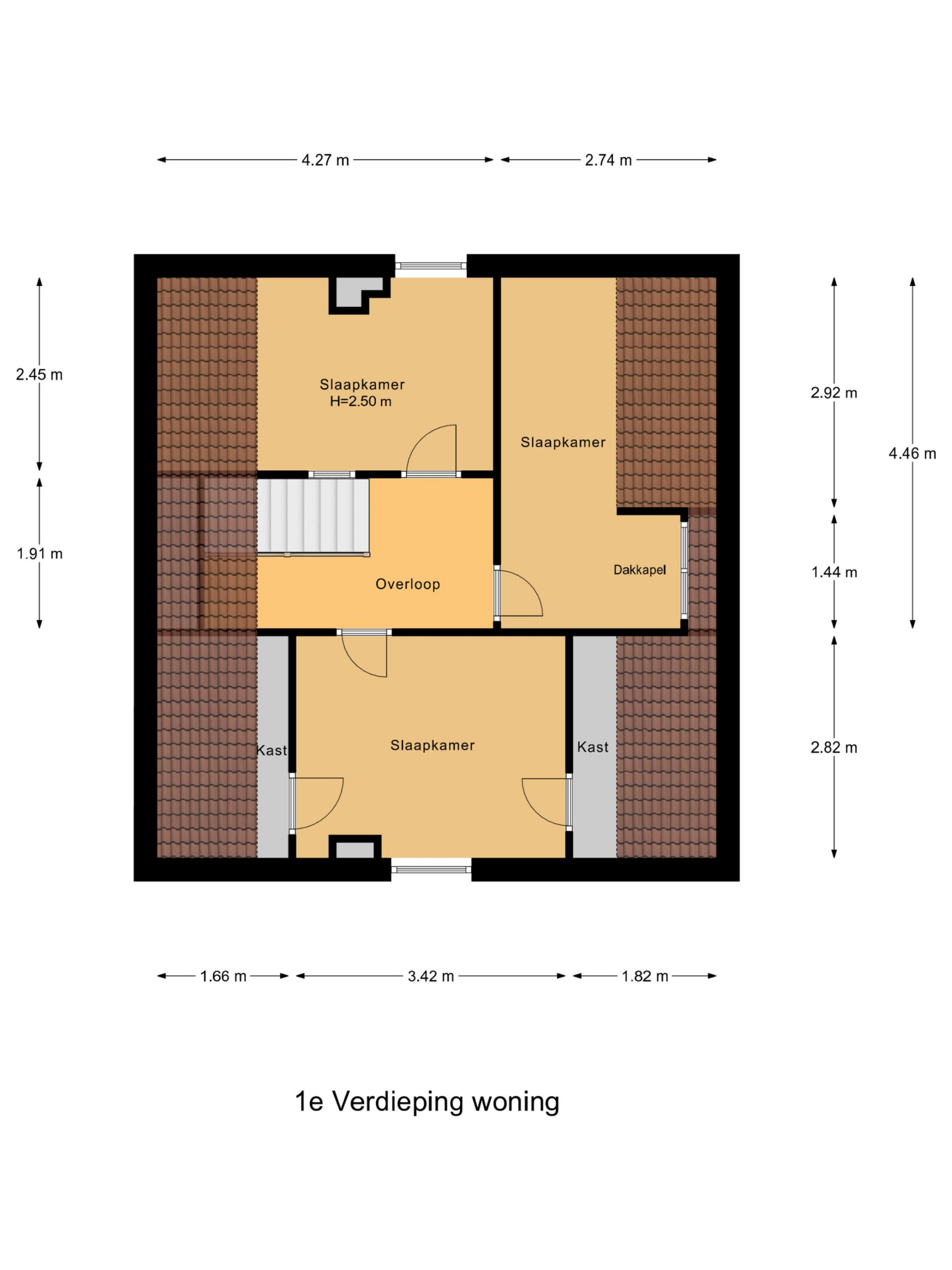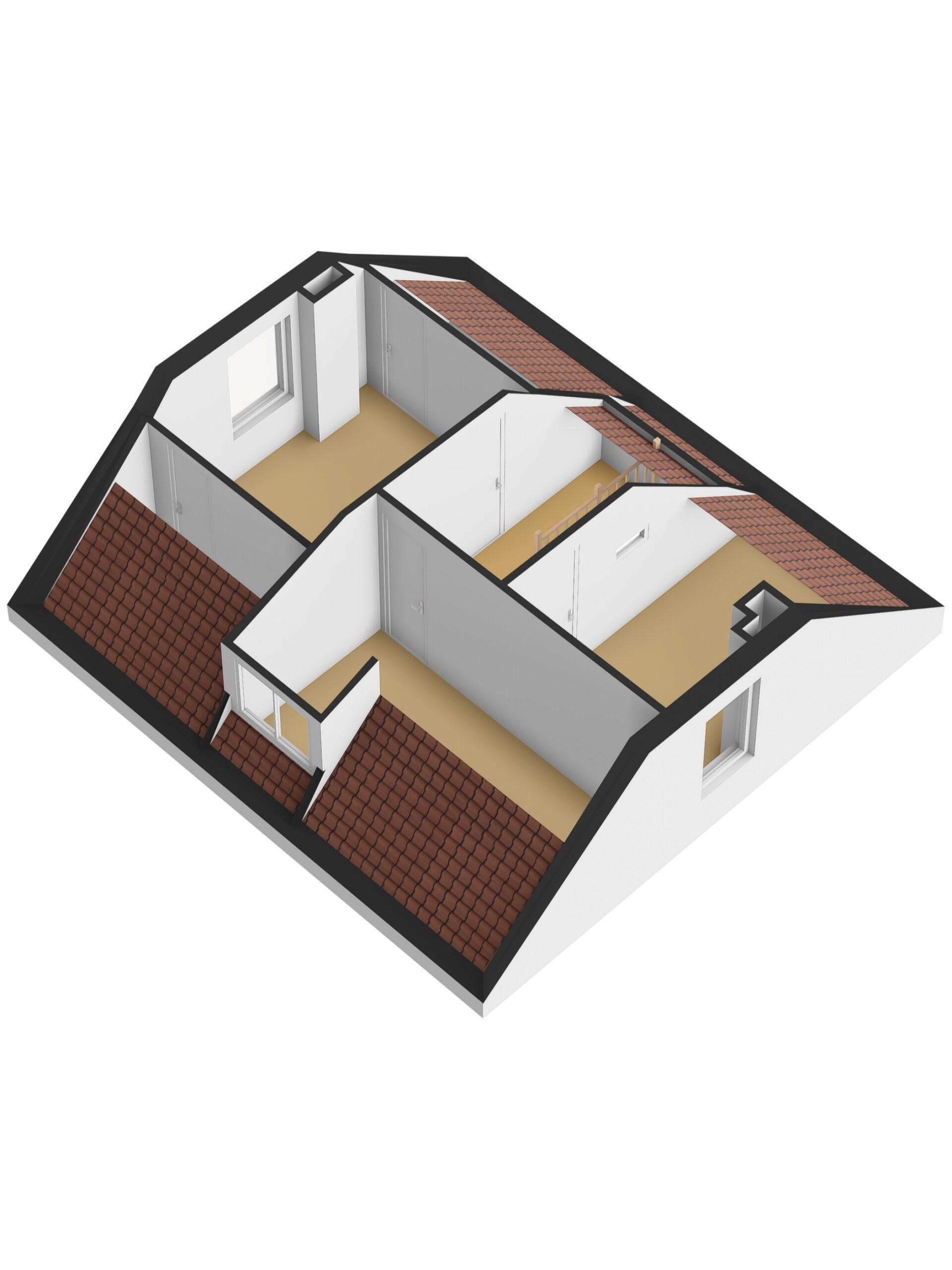Via de vaste trap bereik je de overloop met toegang tot drie keurige slaapkamers. De kamers zijn voorzien van vaste kasten, dakramen of dakkapalen en beschikken over praktische bergruimte achter knieschotten. De karakteristieke houten spanten geven de ruimtes een authentieke uitstraling. De hoofslaapkamer biedt volop ruimte. De andere twee zijn eveneens licht en functioneel ingericht.