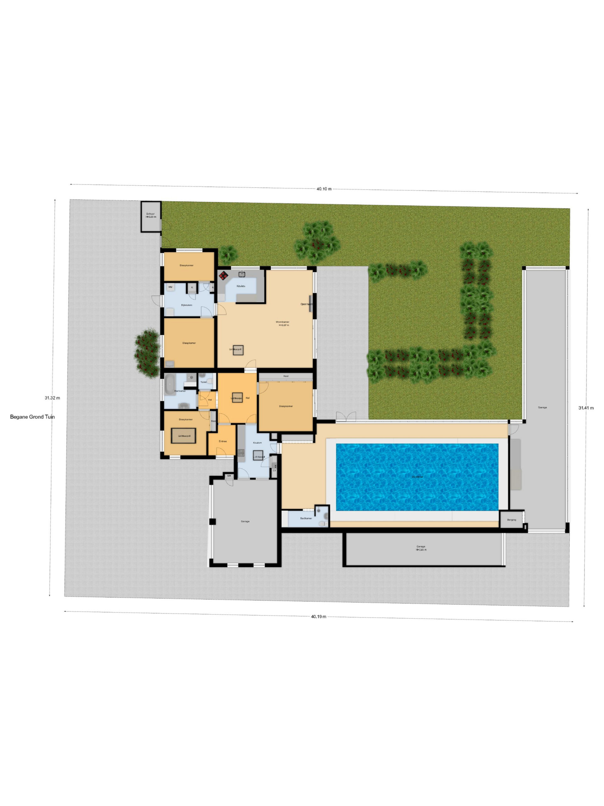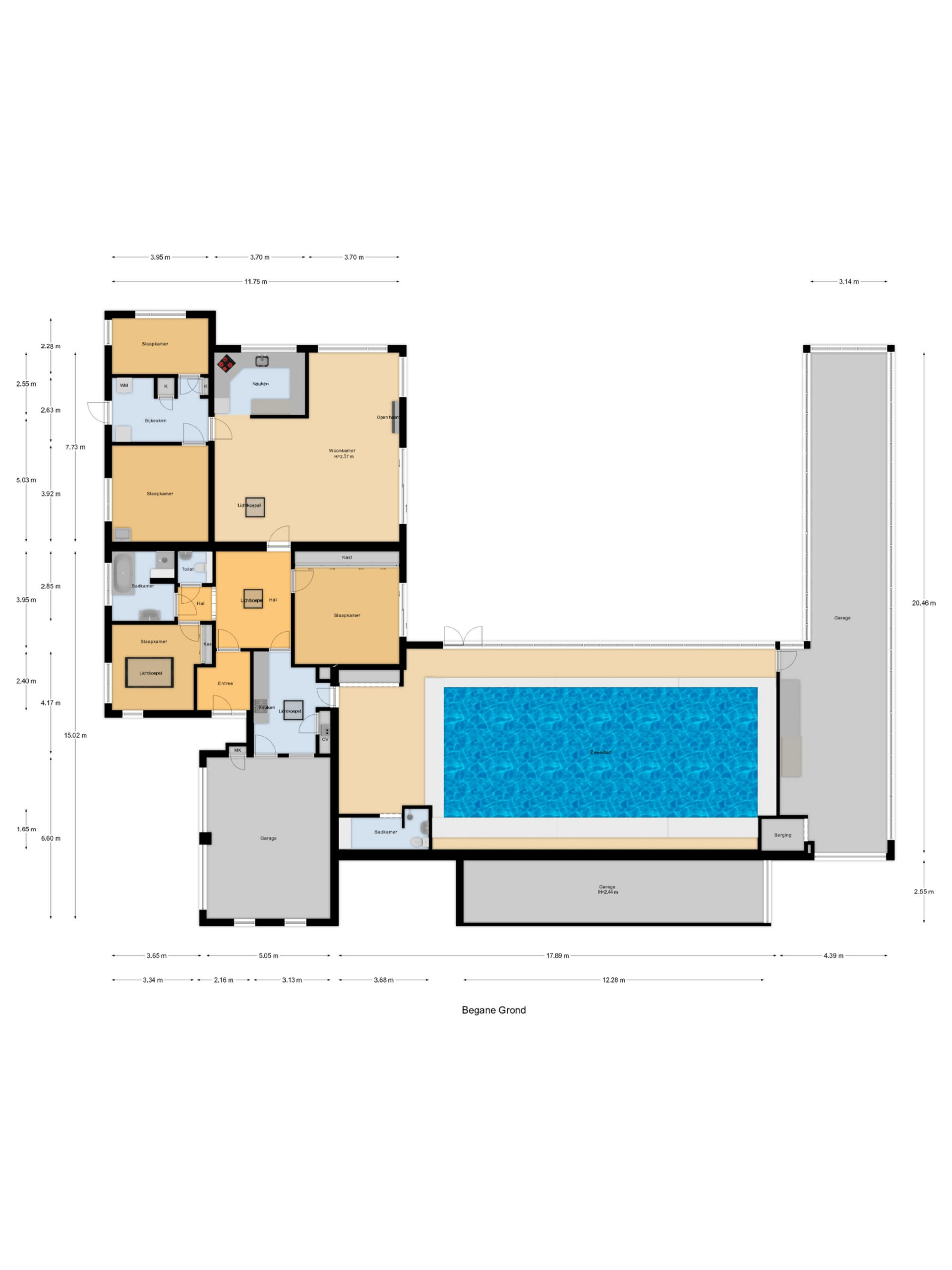 Vanuit de centrale hal bereikt u de tweede bijkeuken met extra keukenblok en kastruimte. Deze ruimte geeft toegang tot zowel de inpandige garage als het unieke, inpandige zwembad. De dubbele inpandige garage biedt ruimte voor twee auto’s en is uitgerust met elektrisch bedienbare overheaddeuren. Daarnaast beschikt de garage over een praktische kelder, ideaal voor extra opslag.