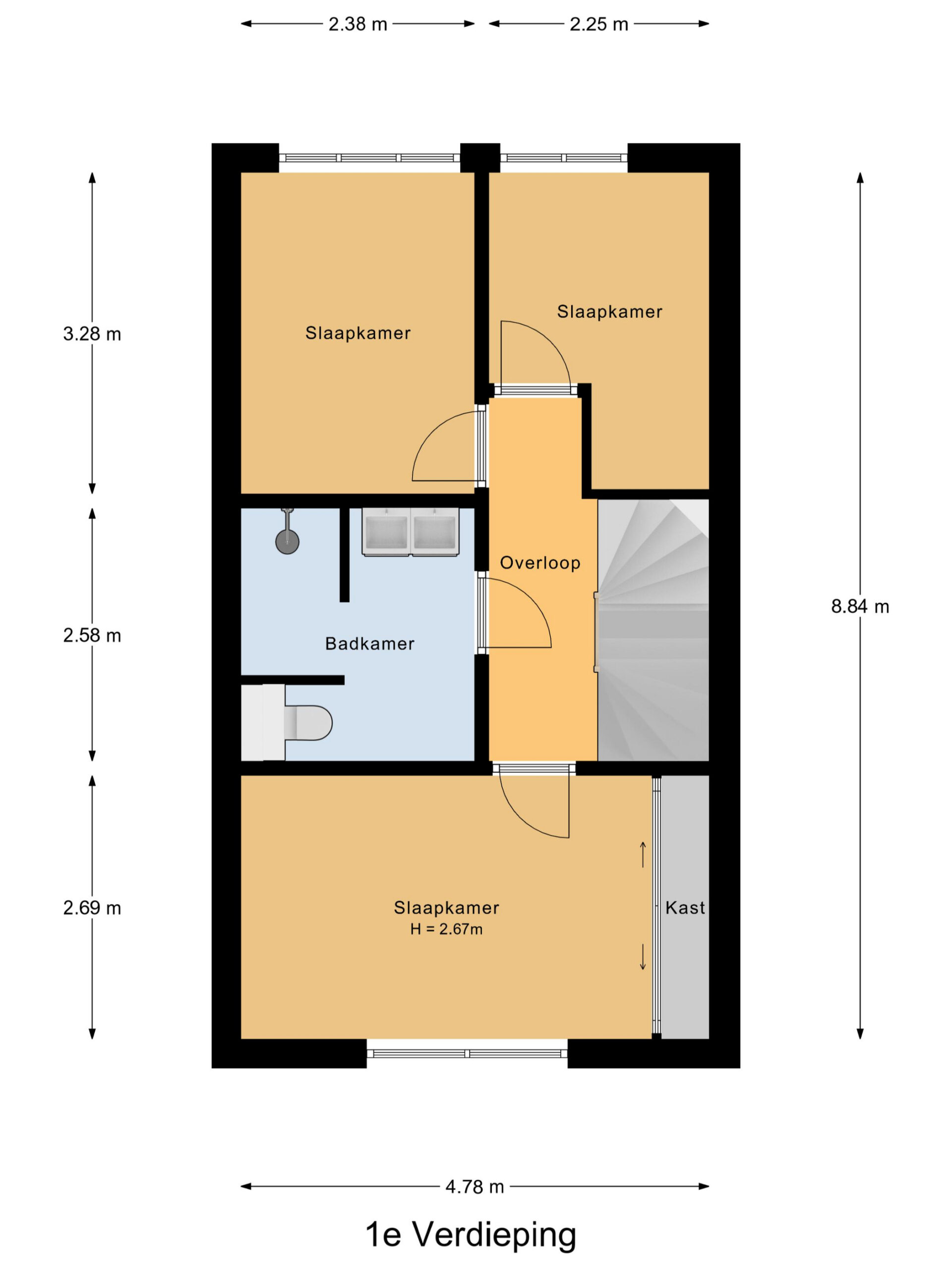 Via de vaste trap bereikt u de overloop, die toegang biedt tot drie ruim bemeten slaapkamers. Twee slaapkamers bevinden zich aan de achterzijde van de woning en zijn uitgerust met elektrische rolluiken. De hoofdslaapkamer ligt aan de voorzijde en beschikt over een vaste kast. Alle slaapkamers zijn daarnaast voorzien van horren. De moderne badkamer is stijlvol afgewerkt met grijs-witte tegels en ingericht met een inloopdouche, wandtoilet en wastafelmeubel.