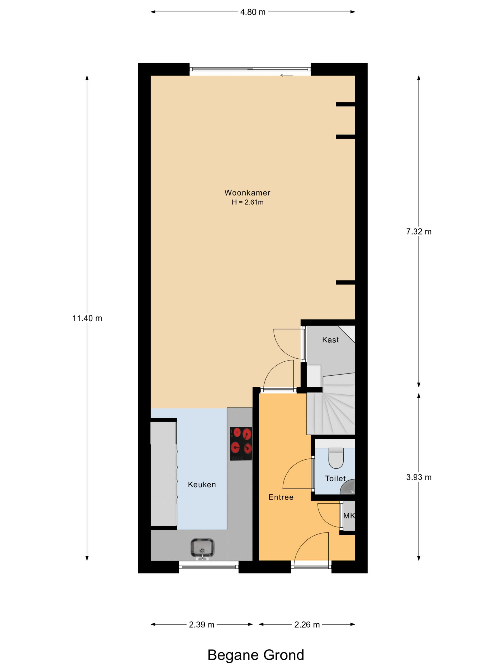 Via de verzorgde voortuin bereikt u de entree van de woning. In de hal vindt u de garderobe, meterkast, een modern afgewerkte toiletruimte met wandtoilet en fonteintje, en de trapopgang naar de eerste verdieping. Vanuit hier stapt u de lichte, uitgebouwde woonkamer binnen, voorzien van een plavuizen vloer met vloerverwarming en een open keuken aan de voorzijde. Deze keuken in U-opstelling is uitgevoerd met houtlook frontjes, een donker composieten werkblad en diverse inbouwapparatuur, te weten een inductiekookplaat, koel/vriescombinatie, vaatwasser, Quooker, combi oven/magnetron, oven en een afzuigkap met plasma filter. Dankzij de nette afwerking en de ruime hoeveelheid kastruimte aan beide zijden is dit een praktische én stijlvolle plek om te koken.