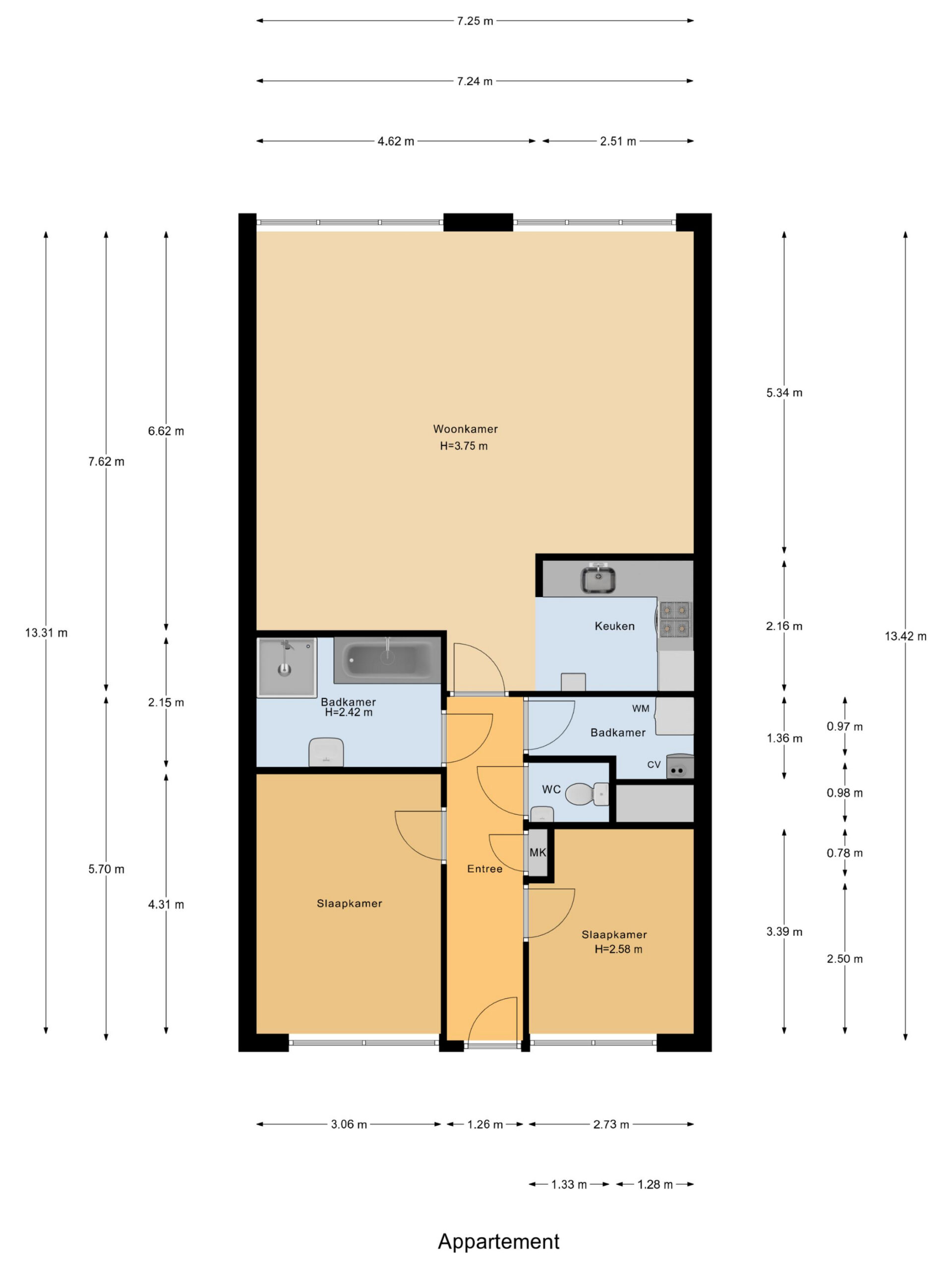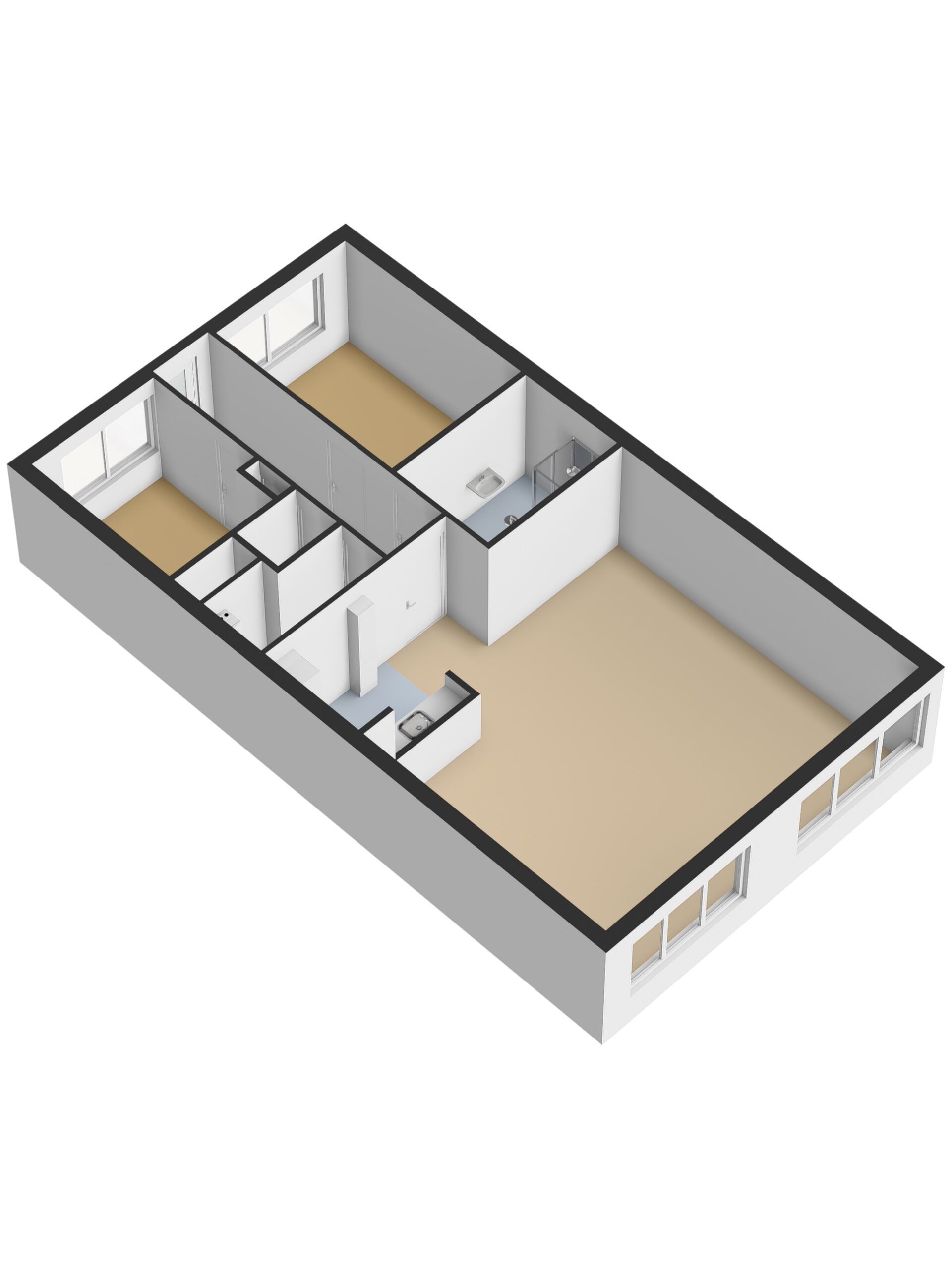 Via de galerij bereikt u de entree van het appartement. De hal biedt toegang tot twee slaapkamers, een wasruimte, de badkamer en de royale woonkamer met open keuken.