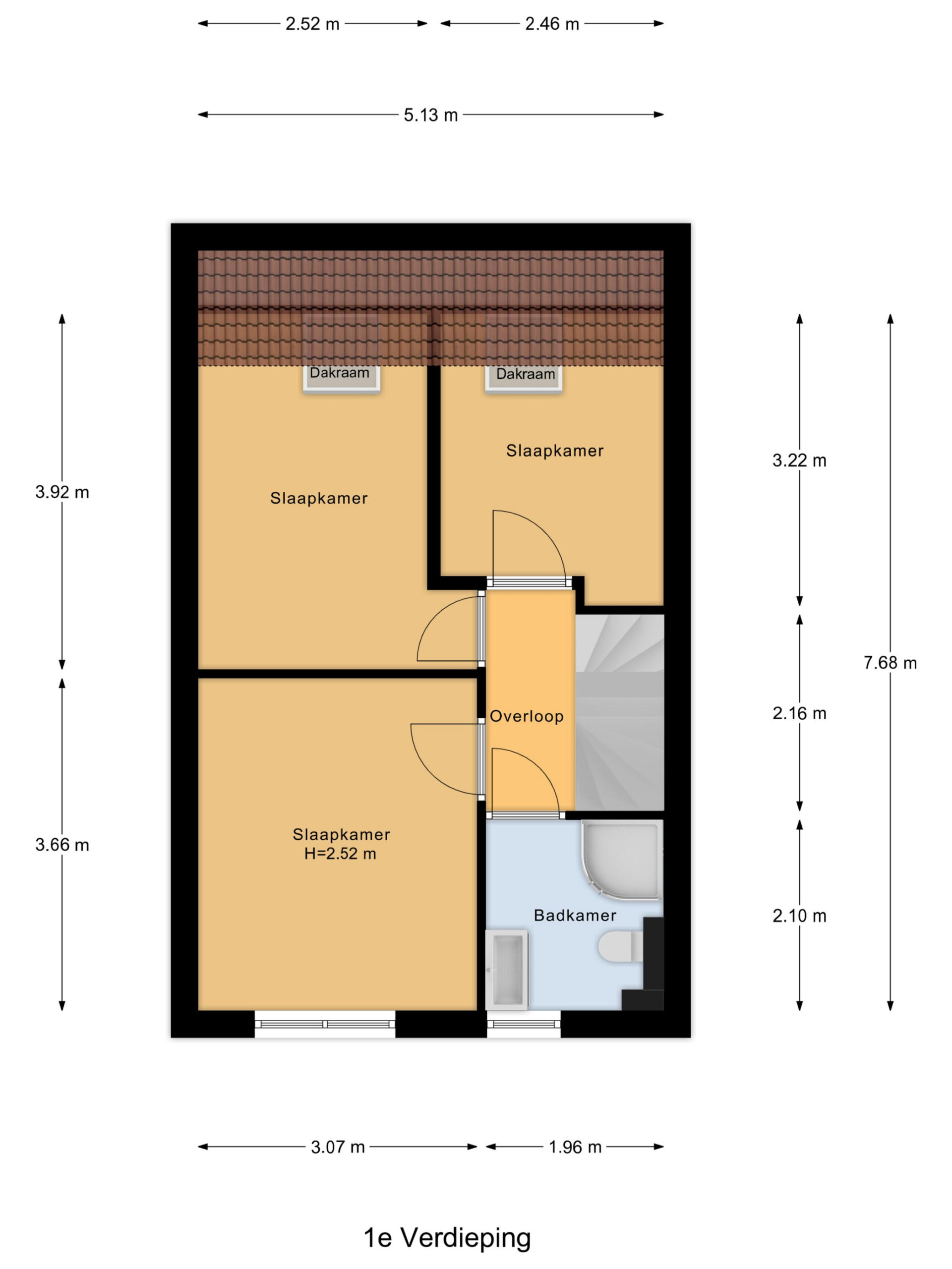 Middels de vaste trap vanuit de hal bereikt u de eerste verdieping. De overloop geeft toegang tot 3 slaapkamers en de badkamer. De twee slaapkamers aan de achterzijde zijn voorzien van een dakraam en praktische bergruimte onder het schuine dak. Door het plaatsen van een dakkapel kunnen deze kamers eenvoudig worden vergroot en voorzien van extra lichtinval. De slaapkamer aan de voorzijde is eveneens goed van formaat en biedt een prettig vrij uitzicht. De naastgelegen badkamer is volledig betegeld in een neutrale combinatie van witte wandtegels en antraciet vloertegels, wat zorgt voor een rustige en tijdloze uitstraling. De ruimte is ingericht met een inloopdouche, tweede toilet, wastafel en een handdoekradiator en is daarmee praktisch in gebruik.