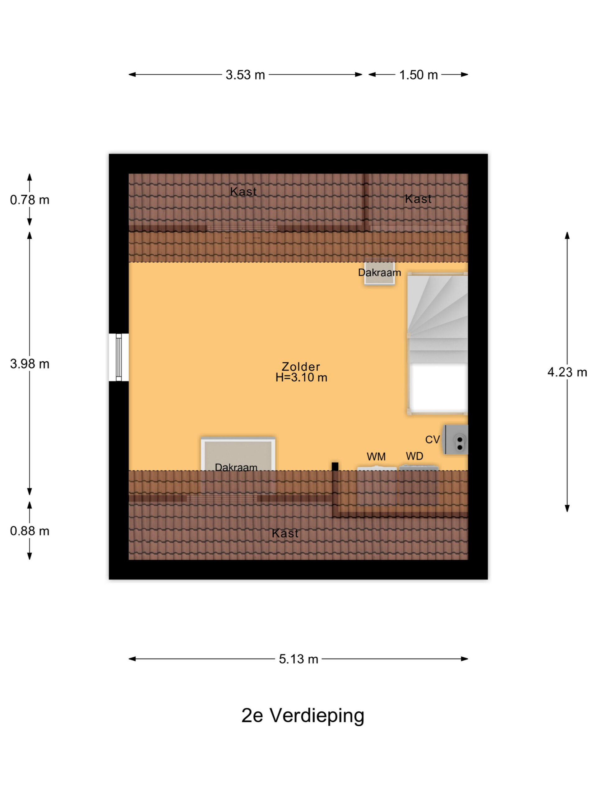 Via de vaste trap bereikt u de tweede verdieping. Deze open zolderverdieping biedt volop mogelijkheden en kan geheel naar eigen wens worden ingedeeld, bijvoorbeeld als extra slaapkamer, hobbyruimte of werkkamer. Op deze verdieping bevinden zich tevens de aansluitingen voor wasmachine en droger, evenals de opstelling van de cv-ketel. Een praktische en veelzijdige ruimte die eenvoudig kan worden aangepast aan jouw woonwensen.