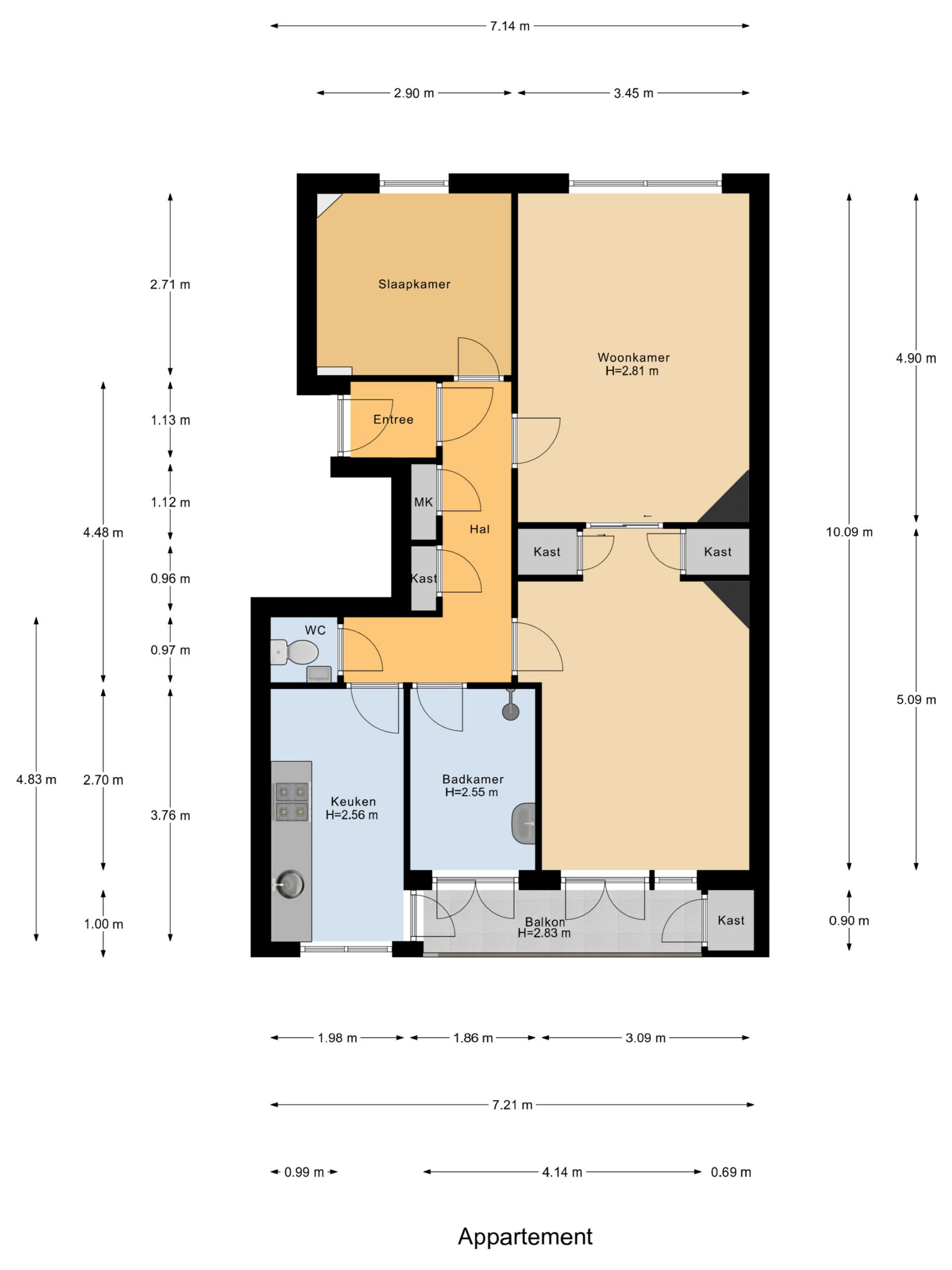 De keuken is aan de achterzijde van het appartement gelegen en biedt toegang tot het balkon. De keuken is eenvoudig uitgevoerd en voorzien van een 4-pits gaskookplaat, spoelbak en afzuigkap. De ruime badkamer is volledig betegeld en beschikt over een douche, wastafel en spiegel. Hier bevindt zich tevens de aansluiting voor wasmachine en droger. Daarnaast is er een separaat toilet aanwezig, bereikbaar vanuit de hal.