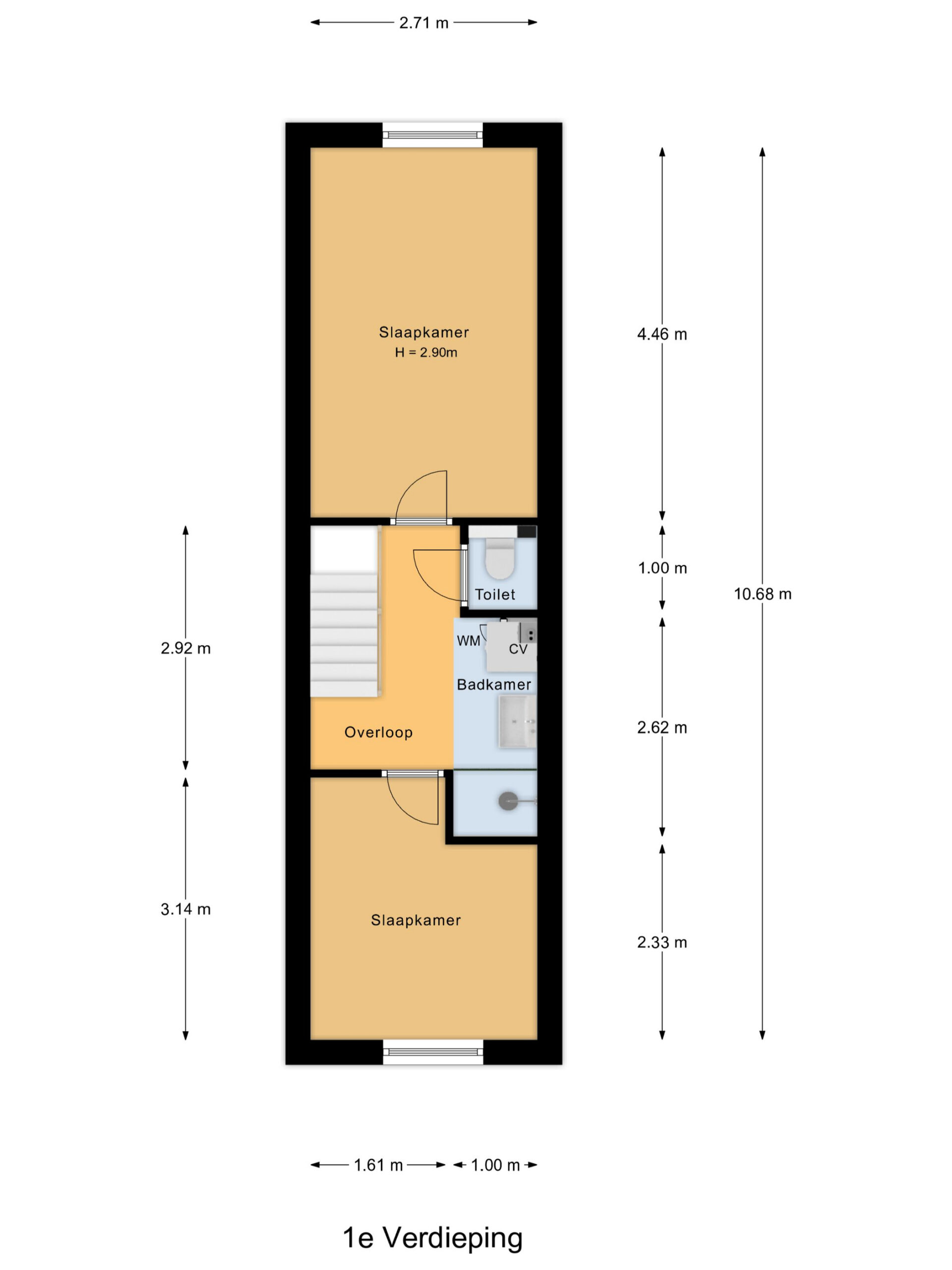 Via de trapopgang bereikt u de overloop, welke toegang biedt tot de douche, een separate wasruimte met wastafel en een toiletruimte. Tevens bevinden zich hier twee slaapkamers. De ruime hoofdslaapkamer is gelegen aan de achterzijde van de woning. De slaapkamer aan de voorzijde is eveneens goed van formaat en bovendien extra geïsoleerd, wat bijdraagt aan het wooncomfort.