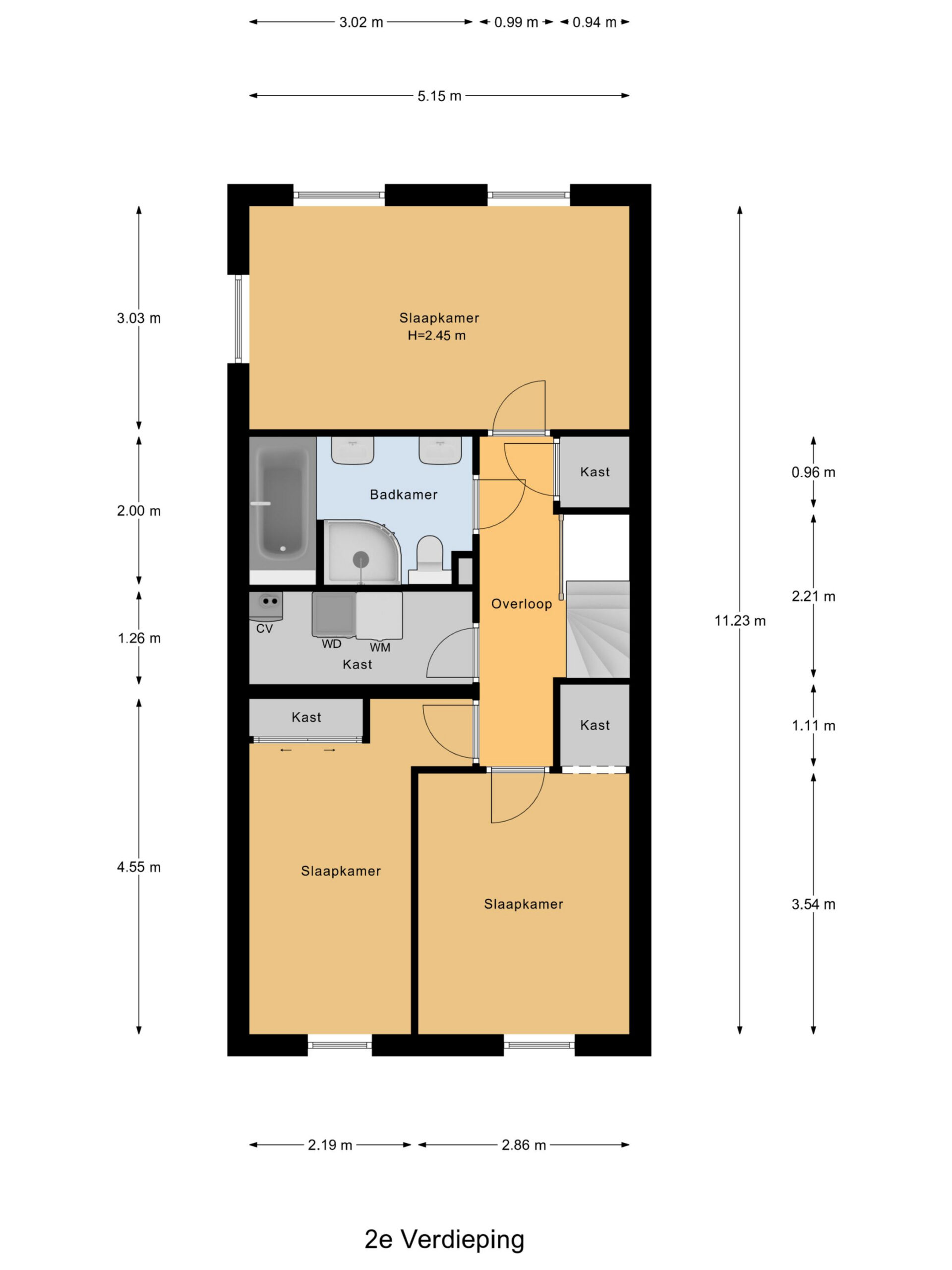 Op de tweede verdieping bevinden zich 3 slaapkamers en een ruime badkamer, ingericht met een ligbad, douche, dubbele wastafel en toilet. Daarnaast is er een aparte wasruimte met aansluitingen voor de wasmachine en droger.