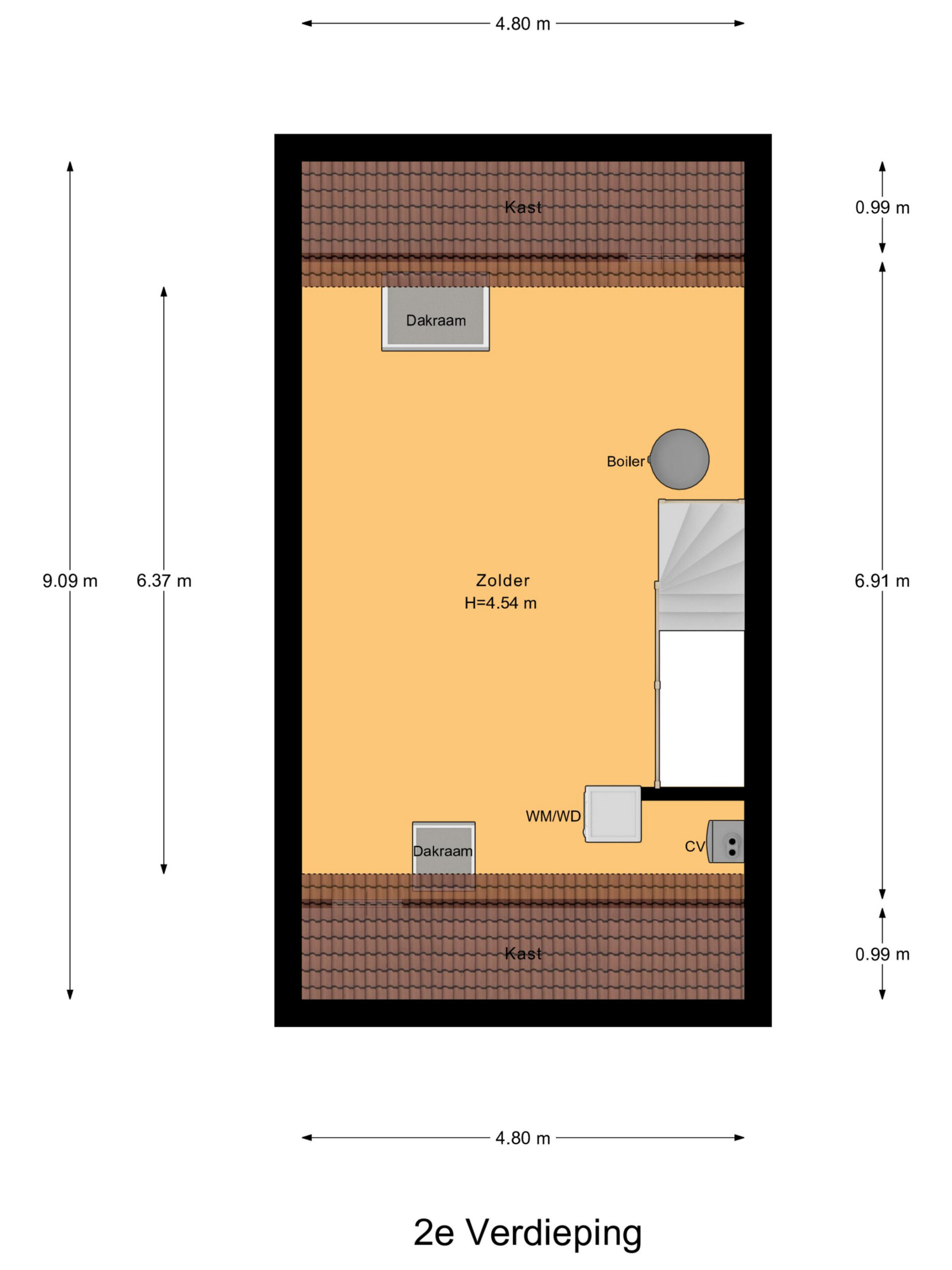 De tweede verdieping is momenteel een open en multifunctionele ruimte die geheel naar eigen wens kan worden ingedeeld. Hier bevinden zich de aansluitingen voor de wasmachine en droger, evenals de opstelplaatsen voor de cv-combiketel en de boiler. Met enkele eenvoudige aanpassingen is deze verdieping uitstekend in te delen in één of zelfs twee (slaap)kamers.