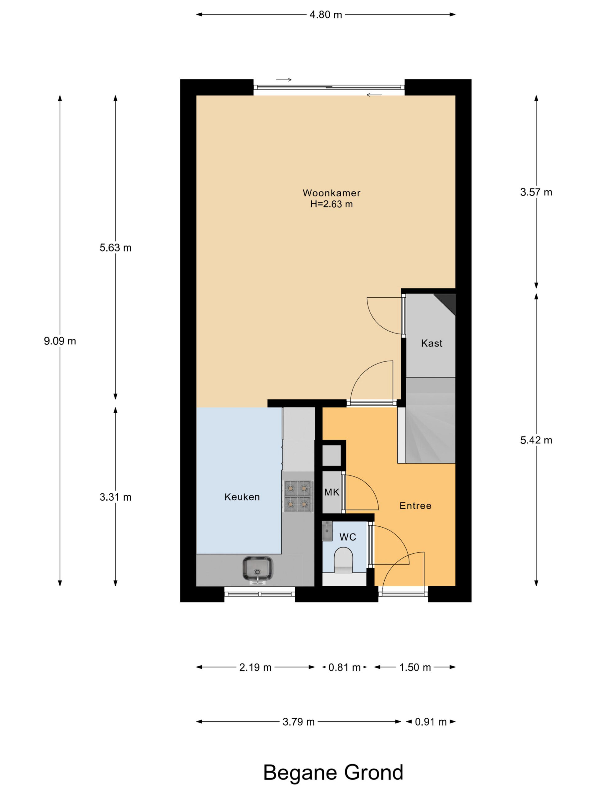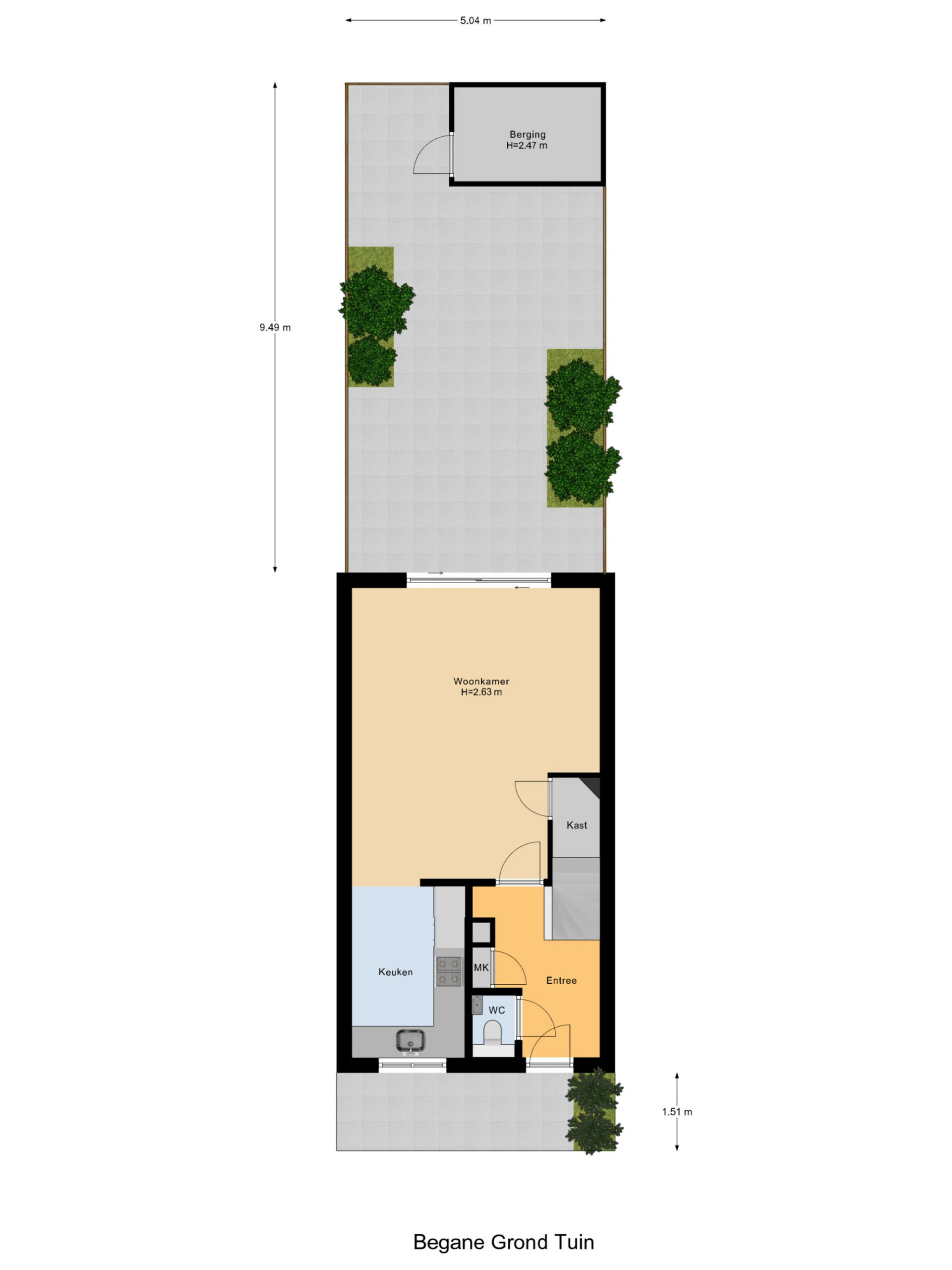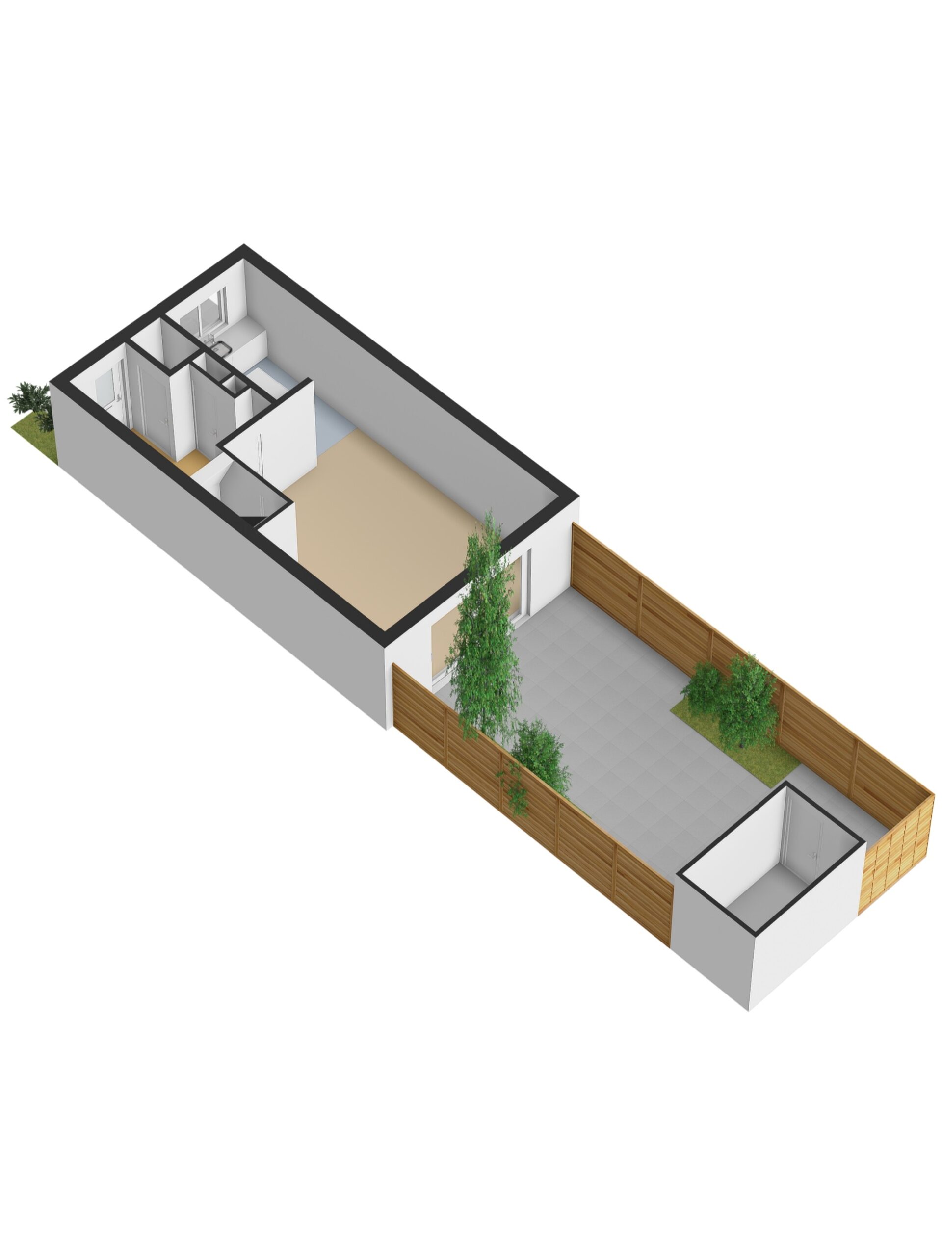 De entree van de woning komt uit in de hal met toiletruimte, meterkast, garderobe, vaste trapopgang en een toegangsdeur naar de tuingerichte woonkamer. De woonkamer is gelegen aan de achterzijde van de woning en beschikt over een strakke pvc vloer met vloerverwarming. De diepe trapkast biedt praktische bergruimte; hier bevindt zich tevens de aansluiting van de vloerverwarming.