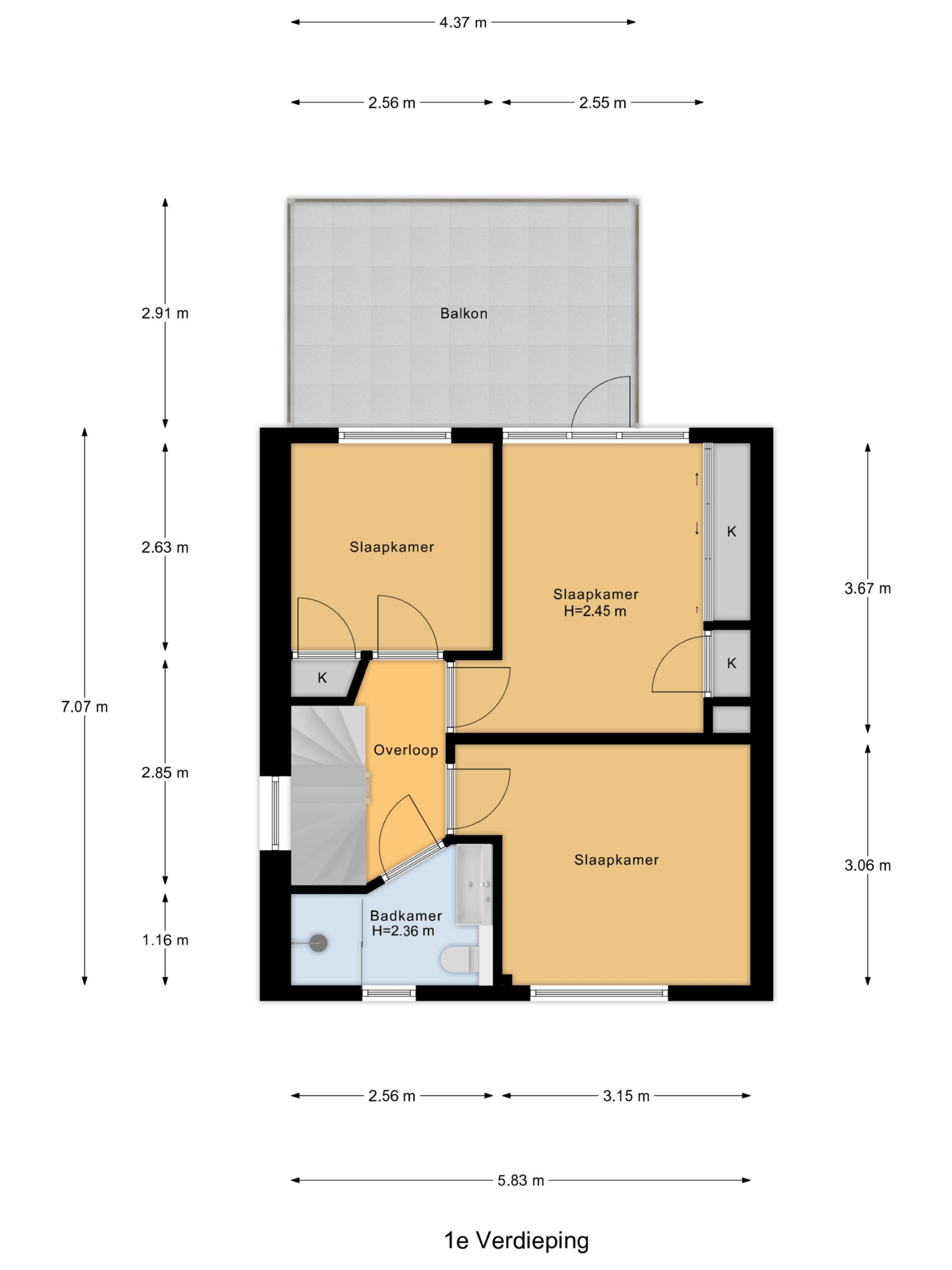 De overloop op de eerste verdieping biedt toegang tot drie slaapkamers en de badkamer. Aan de achterzijde bevinden zich twee slaapkamers, waarvan één toegang geeft tot het ruime dakterras. Aan de voorzijde is de derde slaapkamer gesitueerd. De badkamer is modern uitgevoerd en compleet ingericht met een inloopdouche, wastafelmeubel en wandcloset. De badkamer is voorzien van vloerverwarming.