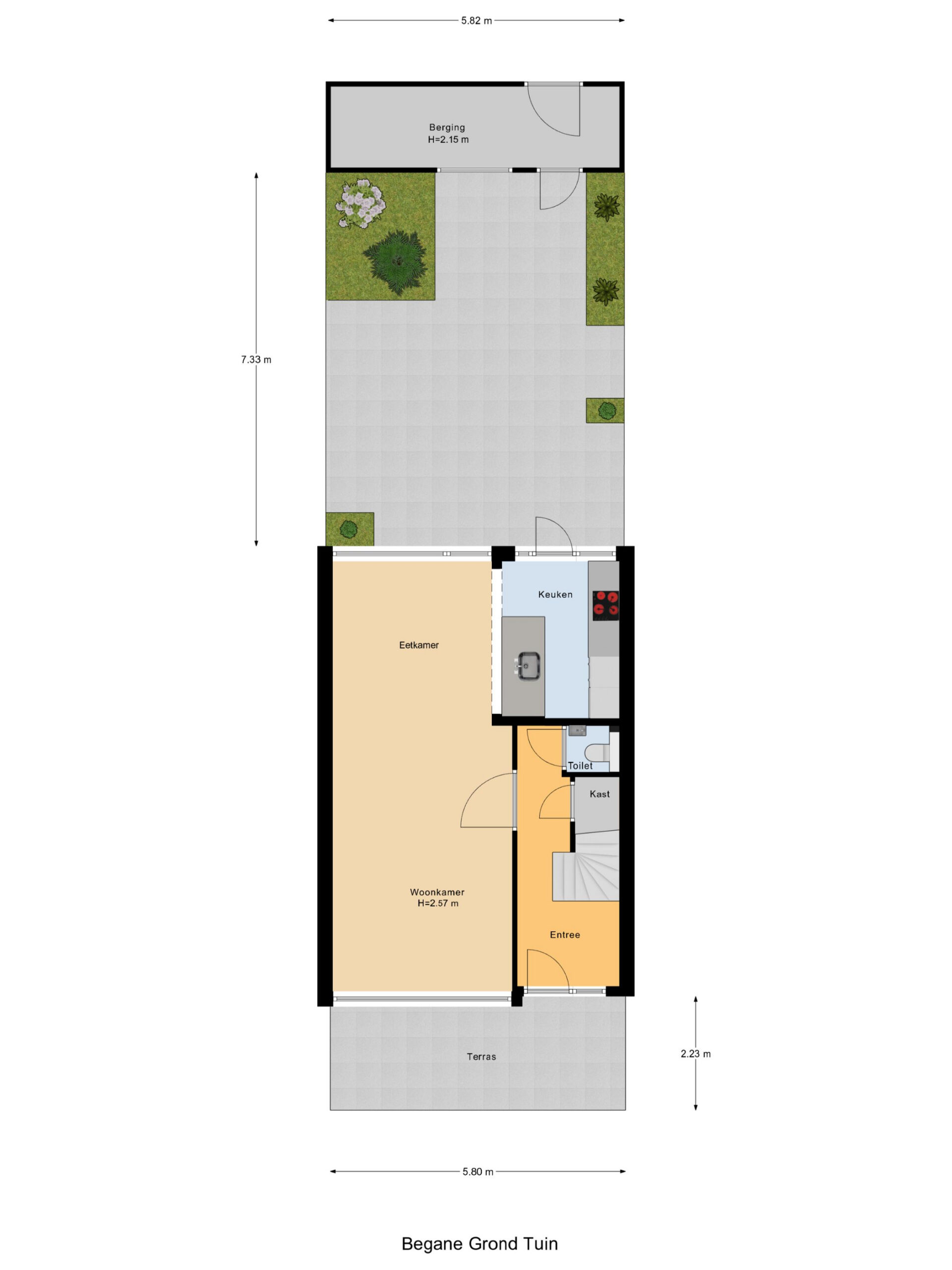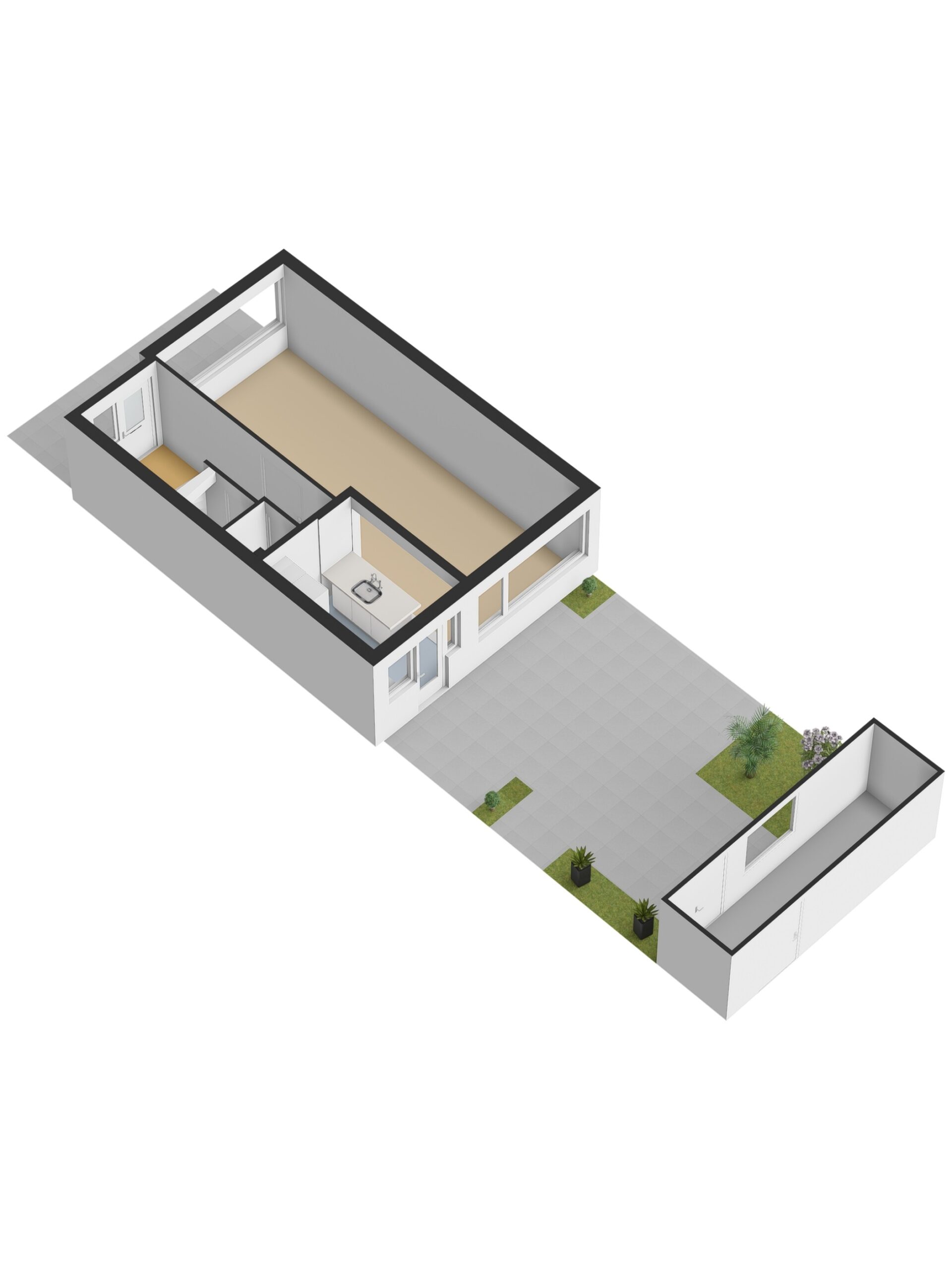 Vanuit de keuken biedt een loopdeur direct toegang tot de zonnige achtertuin, gelegen op het zuidoosten. De tuin is grotendeels betegeld en daarmee onderhoudsvriendelijk, terwijl de groenborders en het kunstgras zorgen voor een speelse en sfeervolle uitstraling. Achterin de tuin staat een ruime vrijstaande stenen berging, ideaal voor fietsen en extra opslag. Via de berging is tevens de achterom bereikbaar.