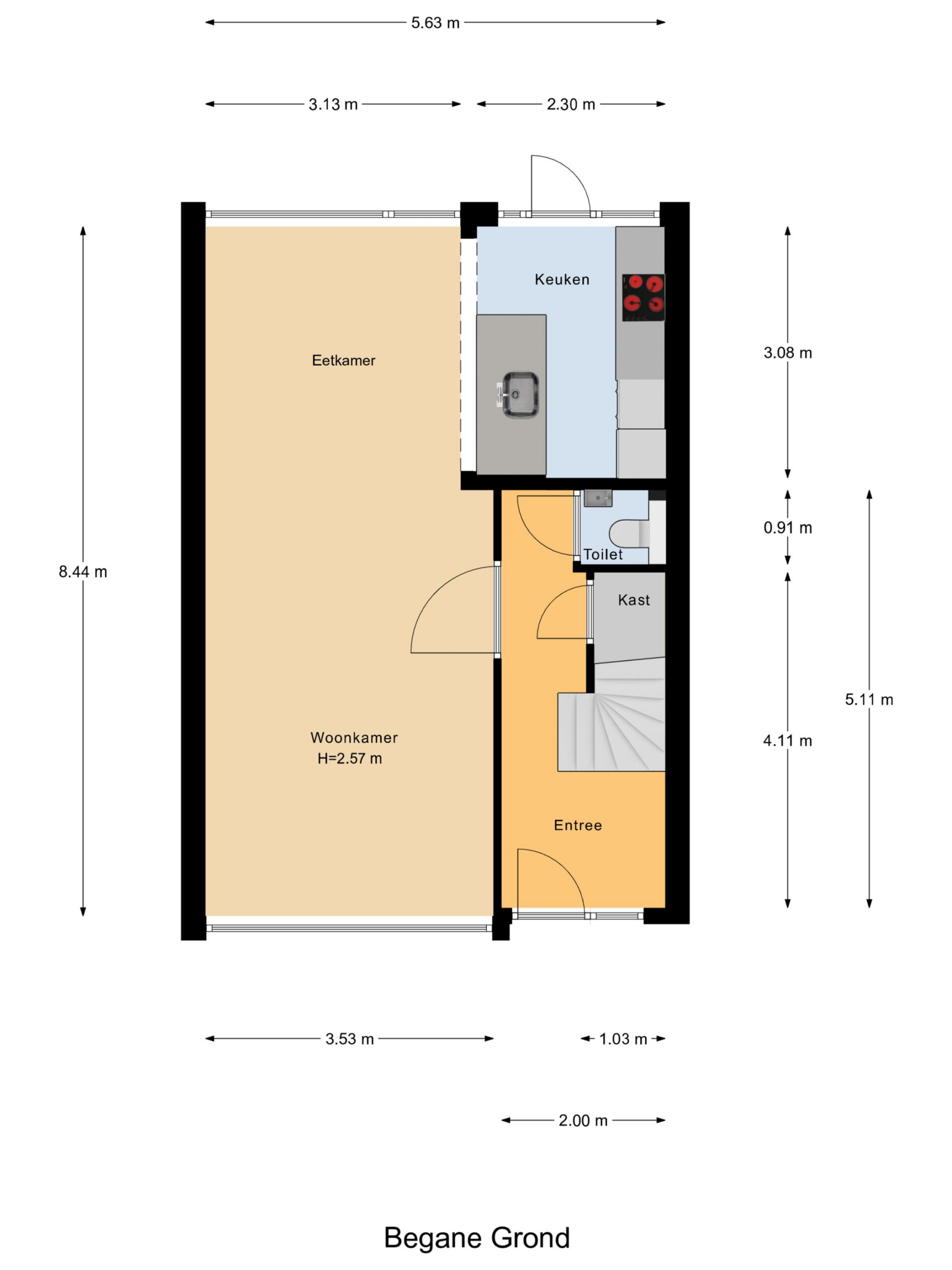 Via de verzorgde voortuin bereikt u de entree van de woning. In de hal is ruimte voor een garderobe en bevinden zich de meterkast, het volledig betegelde toilet met fonteintje, een praktische trapkast en de trapopgang naar de eerste verdieping. Vanuit de hal heeft u toegang tot de woonkamer.