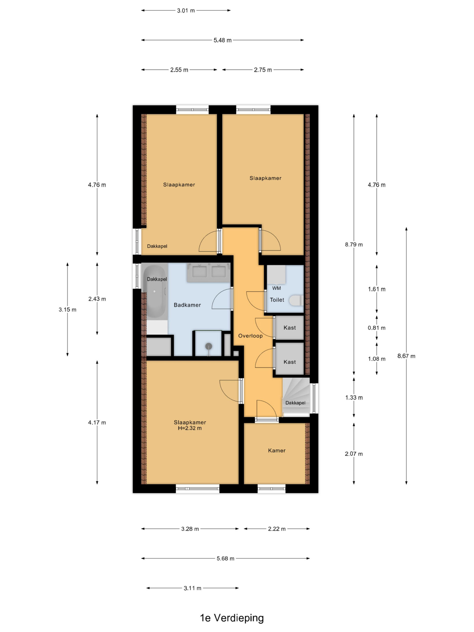 Via de trap bereikt u de overloop van de eerste verdieping. Dankzij het aanwezige raam beschikt deze ruimte over natuurlijke lichtinval. Vanaf de overloop zijn vier slaapkamers, de badkamer en diverse vaste kasten toegankelijk. De slaapkamer aan de voorzijde beschikt over een airco-unit.
